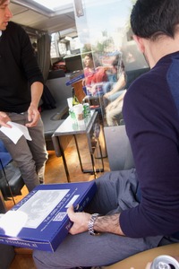This photograph captures a lighthearted moment in an indoor setting where two men engage over a pizza box, creating an atmosphere of camaraderie. The soft, natural light streaming in illuminates the scene, highlighting the reflections on the glass and the cozy interior design. The composition draws the viewer's eye to the interaction, emphasizing the shared experience and relaxed vibe among friends.