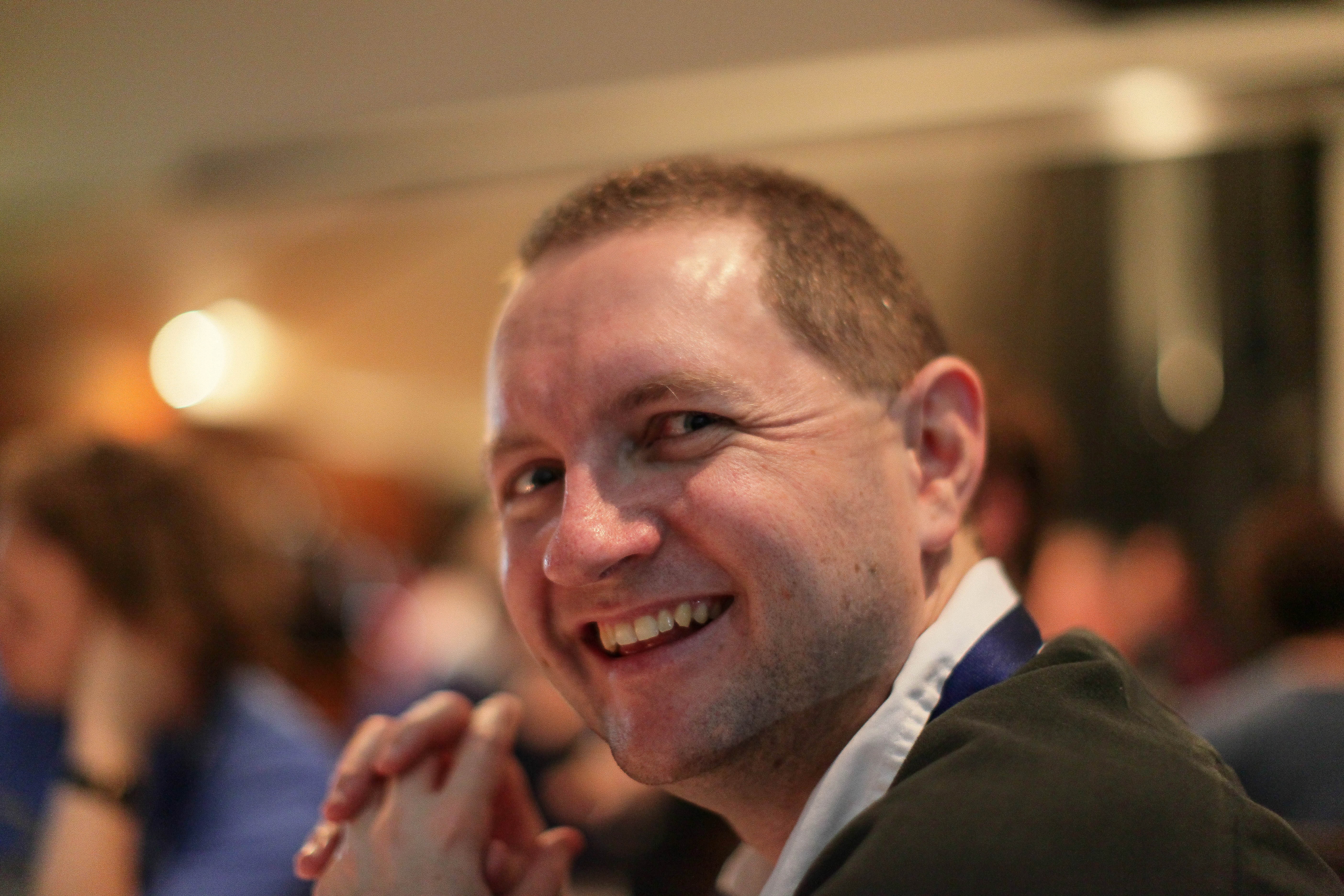 The photograph captures a man with a genuine smile, exuding warmth and approachability. Soft, ambient lighting creates a cozy atmosphere, enhancing the sense of camaraderie in the scene. The blurred background filled with other attendees suggests a lively and engaging gathering, adding to the overall inviting mood.