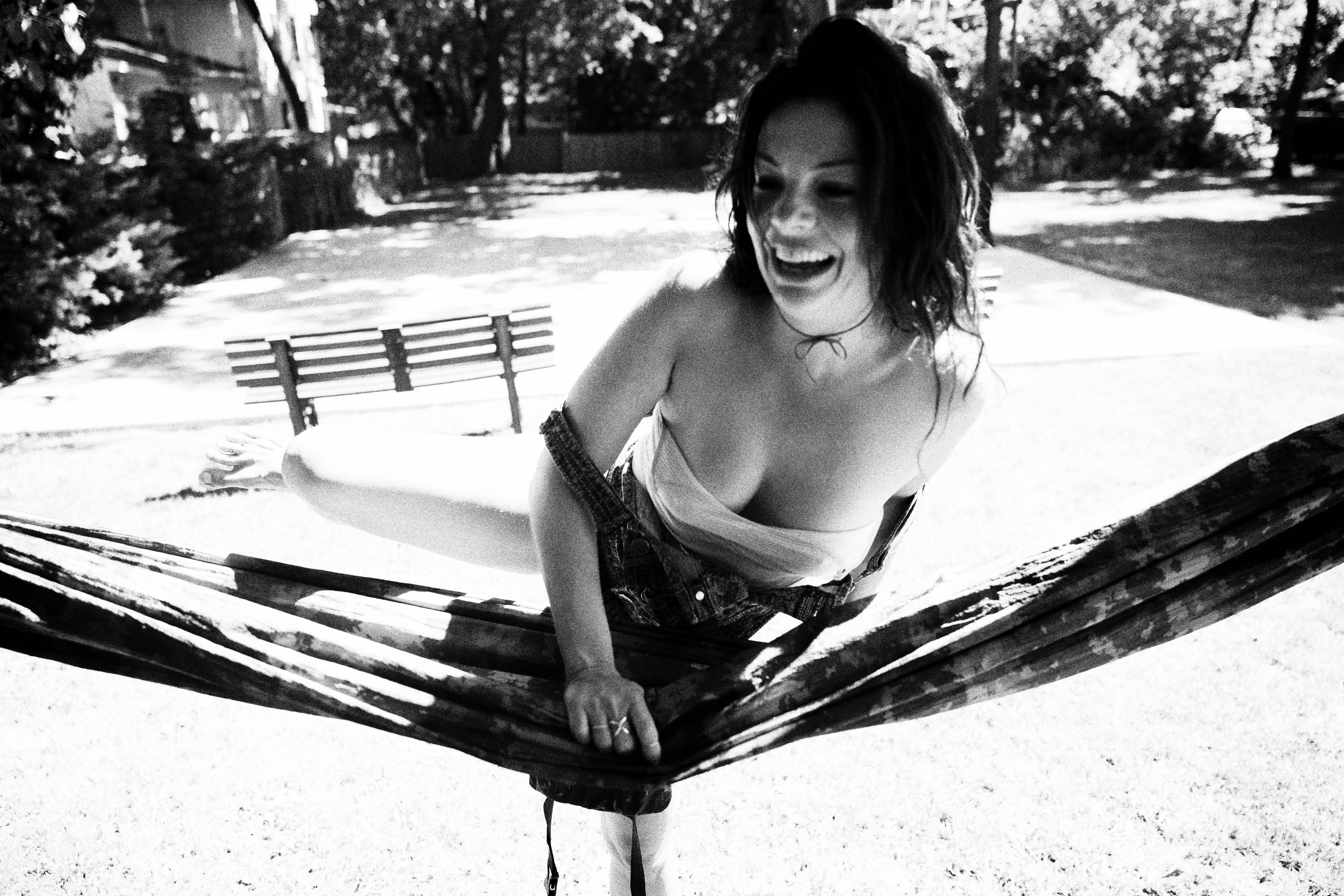 In a sun-drenched garden, a woman playfully navigates a hammock, exuding a sense of carefree joy and spontaneity. The black-and-white composition captures her laughter and relaxed demeanor, highlighting the contrast between the soft lines of her body and the sturdy textures of the hammock. Bright light filters through the trees, casting dappled shadows that enhance the playful, intimate mood of the moment.
