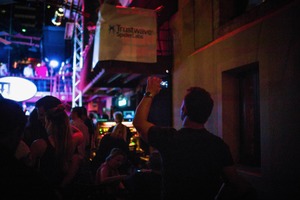 In a dimly lit venue, a crowd buzzes with energy as vibrant lights cast colorful glows across the space. A figure stands at the forefront, capturing the lively atmosphere on their phone, while shadows dance around the enthusiastic audience. The composition highlights the juxtaposition of the individual experience against the electric backdrop of nightlife.