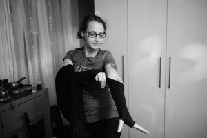 Set in a softly lit room, the image captures a young woman in a moment of introspection as she adjusts her clothing. The interplay of light and shadow creates a serene mood, highlighting her thoughtful expression and the delicate fabric around her arms. Surrounded by personal belongings, the composition evokes a sense of intimacy and everyday beauty.