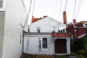 This photograph captures a quiet urban alleyway framed by muted gray walls and contrasting brick details. The soft, diffused light enhances the simplicity of the scene, evoking a sense of stillness and contemplation amidst the backdrop of everyday city life. Narrow lines created by overhead wires draw the eye upward, while the earthy tones of the structures add warmth to the composition.