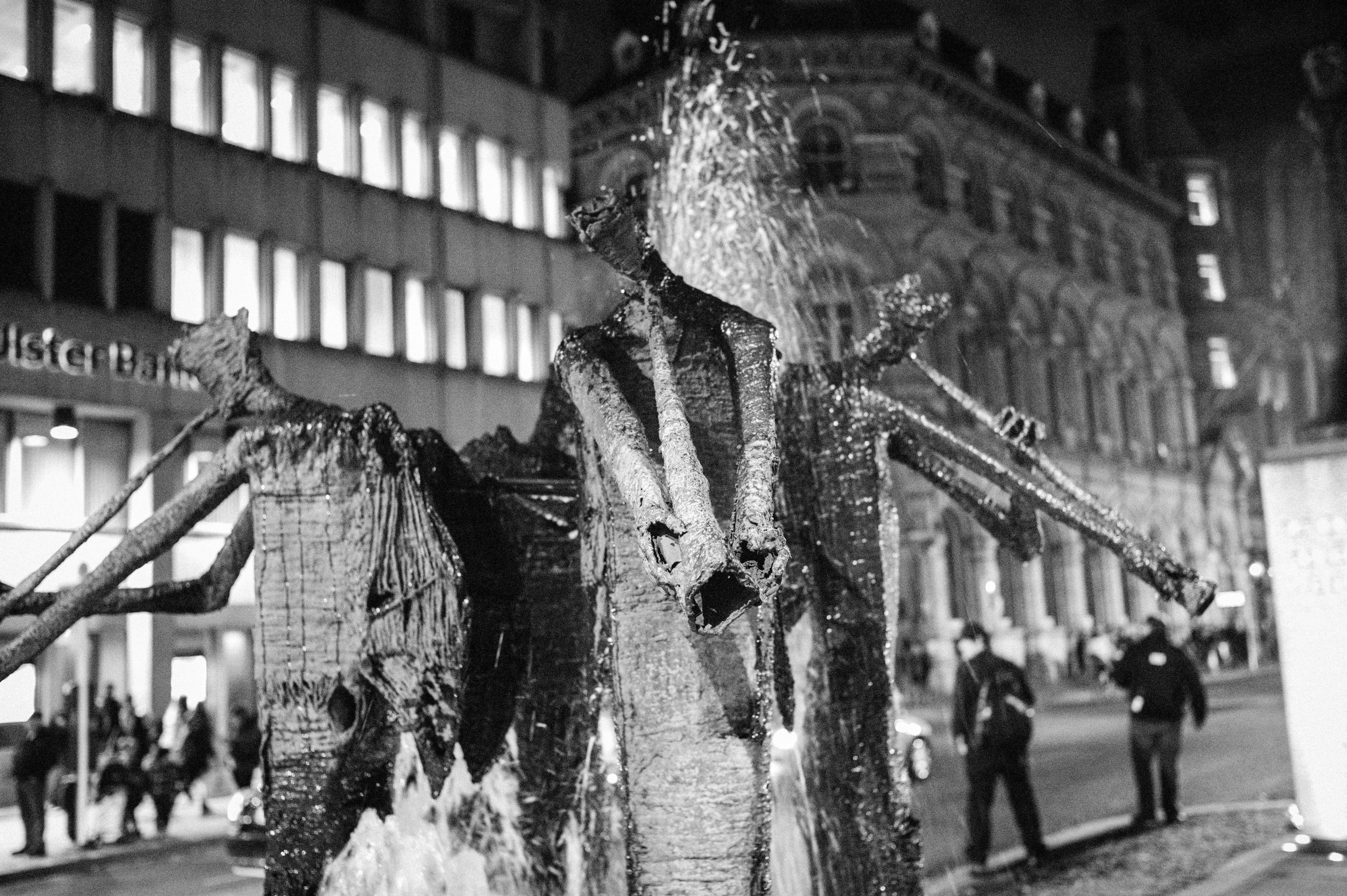 This black-and-white photograph captures a striking fountain sculpture, partially illuminated against the dim urban backdrop. Figures appear to emerge from the water, evoking a sense of mystery and movement, while the surrounding city lights create a sharp contrast, enhancing the overall drama of the scene. The mood is both somber and intriguing, inviting viewers to contemplate the interplay between art and the nocturnal environment.