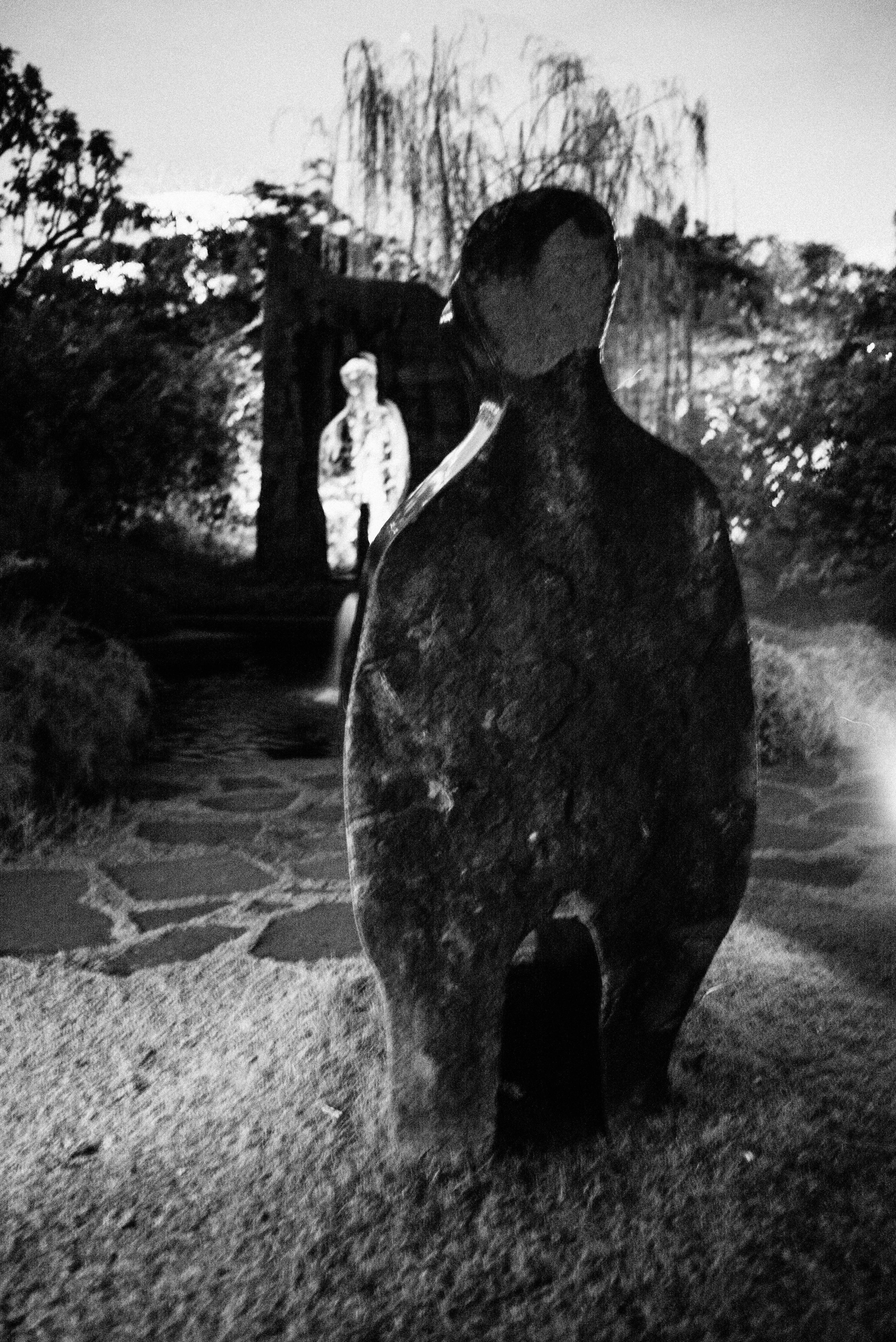 In this haunting black-and-white photograph, a stone figure stands robustly in the foreground, its dark surface contrasting with the ethereal glow of a figure in the distance. Soft lighting filters through the surrounding foliage, creating an air of mystery and introspection. The composition invites viewers to ponder the connection between the solid and the ephemeral, enhancing the mood of quiet contemplation.