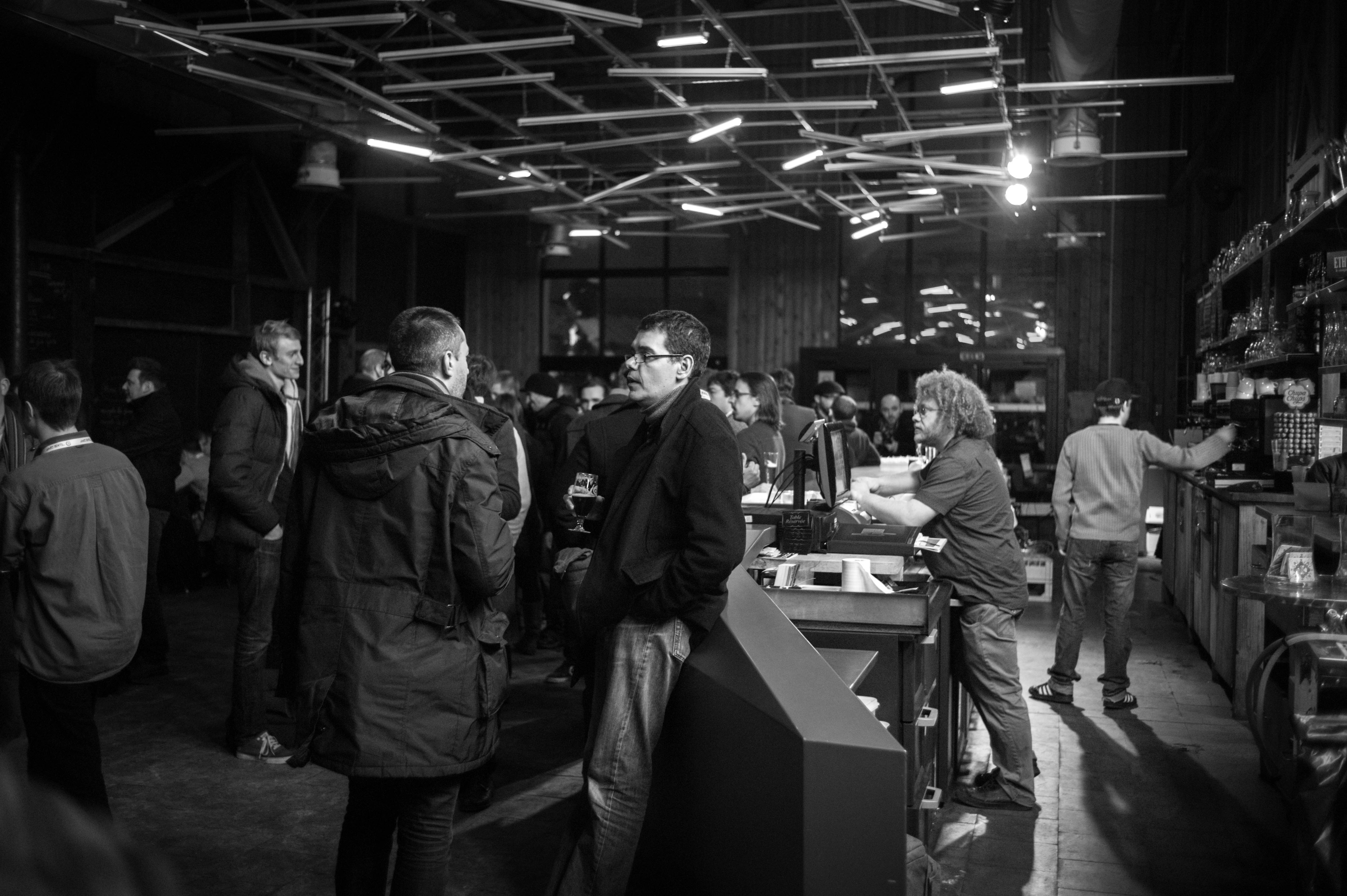 This black-and-white photograph captures a bustling bar scene, filled with animated discussions among a diverse group of patrons. The dim, warm lighting contrasts with the cool tones of the walls, creating a cozy yet vibrant atmosphere, while geometric lines from the overhead lights draw the eye towards the lively bar area.