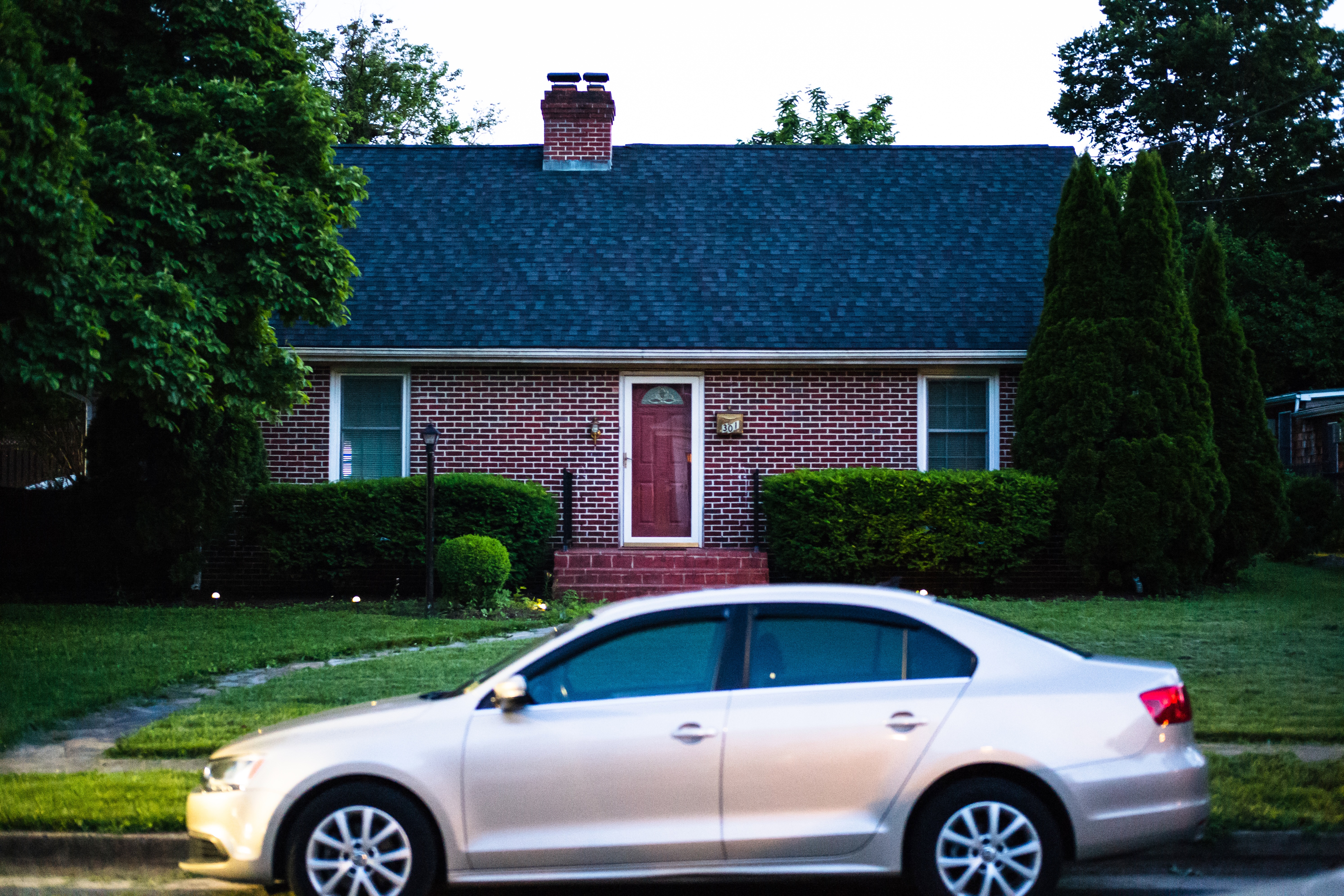 This photograph captures a serene suburban home bathed in the soft glow of dusk. The deep red door stands out against the warm brick exterior, while shadows blend with the gentle greenery, creating a tranquil atmosphere. A sleek silver car parked nearby adds a touch of modernity to the classic charm of the scene.