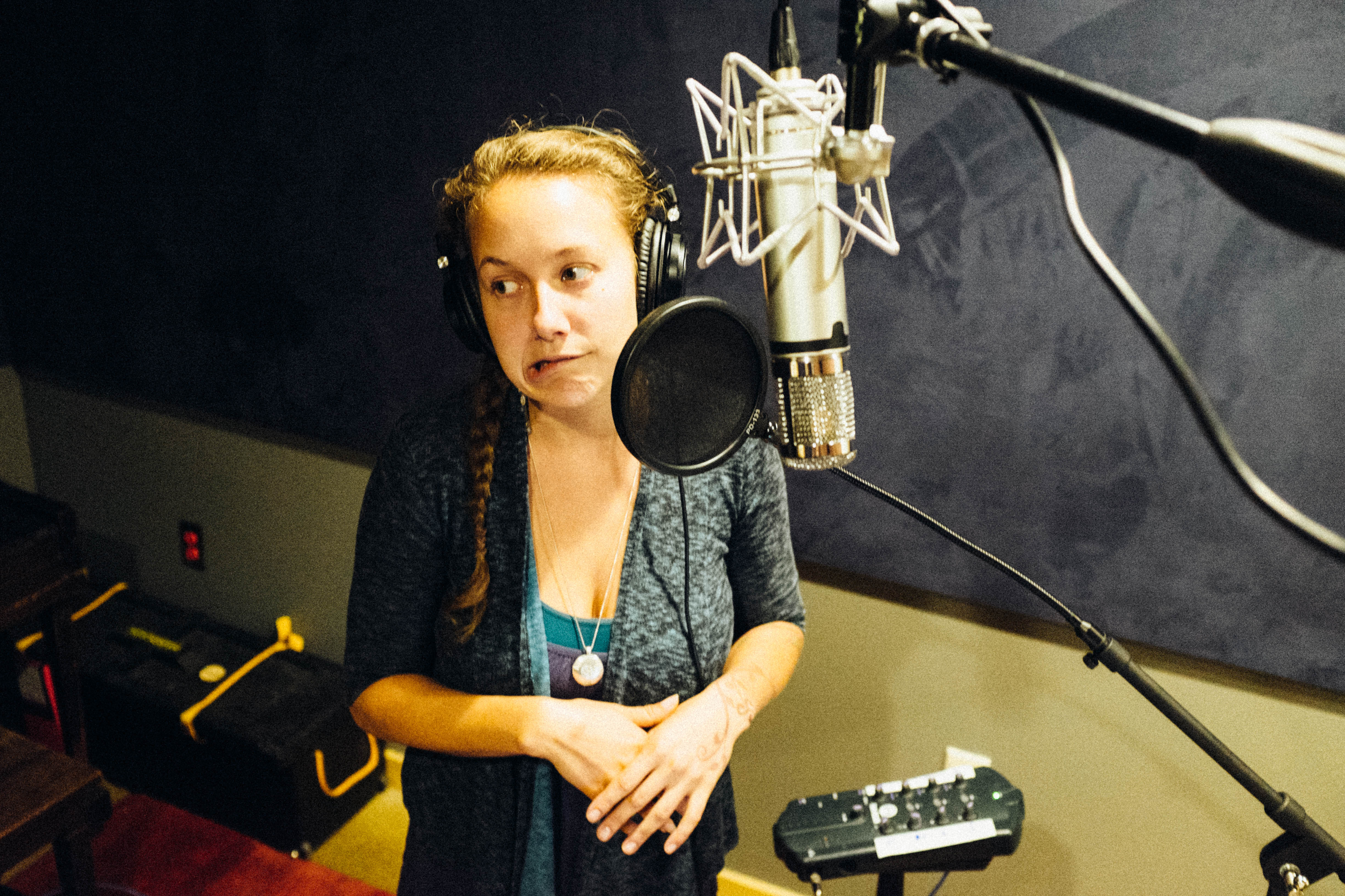 The photograph captures a young woman in a recording studio, caught in a moment of introspection as she stands near a microphone. The warm lighting contrasts with the dark, muted colors of the environment, creating a cozy yet tense atmosphere as she seems to contemplate her next words. Her body language suggests both vulnerability and creativity, highlighting the emotional weight often present in artistic endeavors.