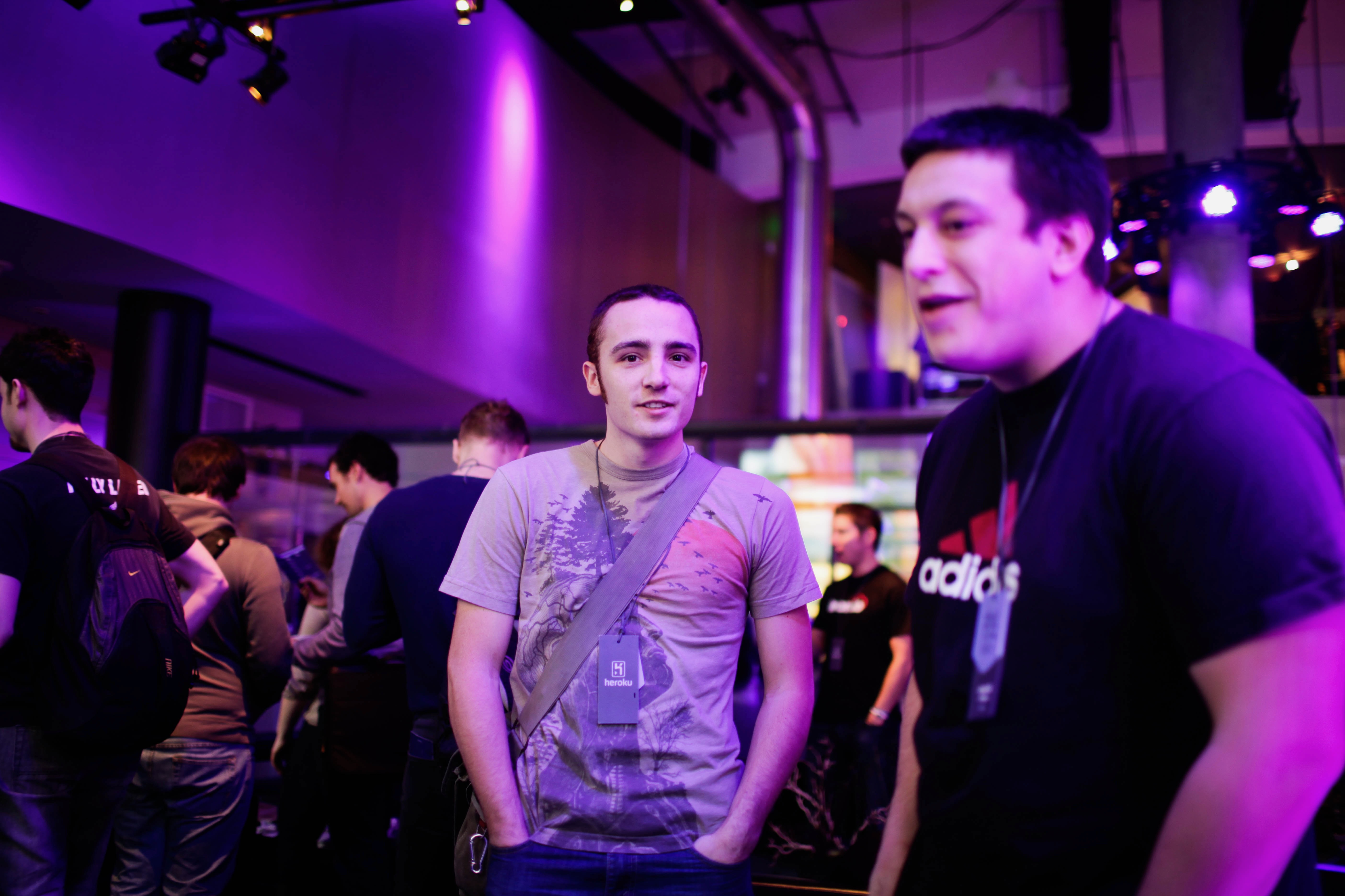 The photograph captures a lively atmosphere at a tech event, with vibrant purple lighting casting a cool hue over the scene. In the foreground, a young man with a friendly smile stands confidently, surrounded by a group of engaged attendees. The mood is energetic and casual, suggesting camaraderie and excitement among fellow enthusiasts.