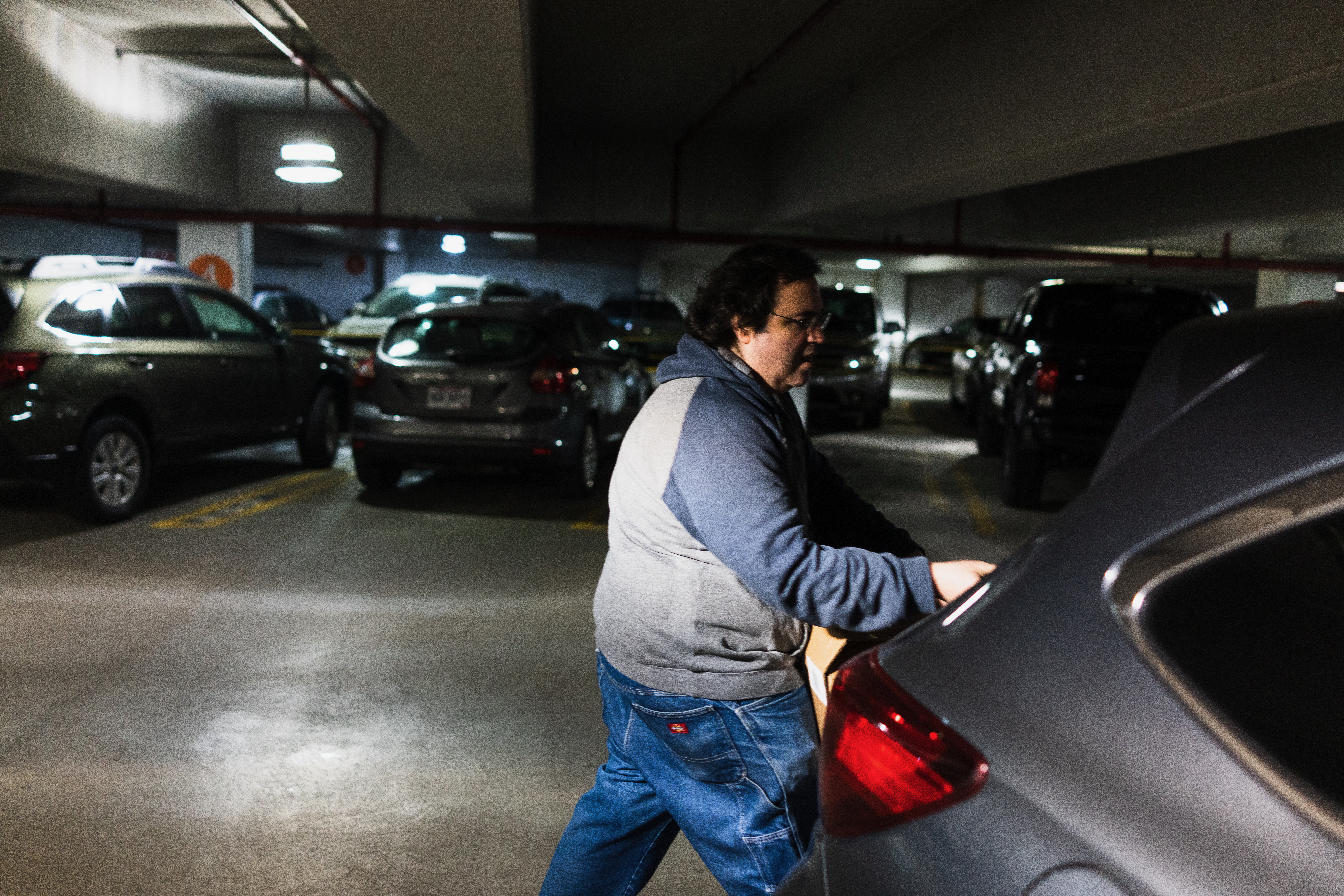 The photograph captures a man in a dimly lit parking garage, highlighting a solitary moment as he approaches a vehicle. The cool tones of the lighting create an atmosphere of introspection, while the surrounding cars add to a sense of isolation. The composition draws attention to the subject’s focused expression, emphasizing the quiet solitude of urban life.