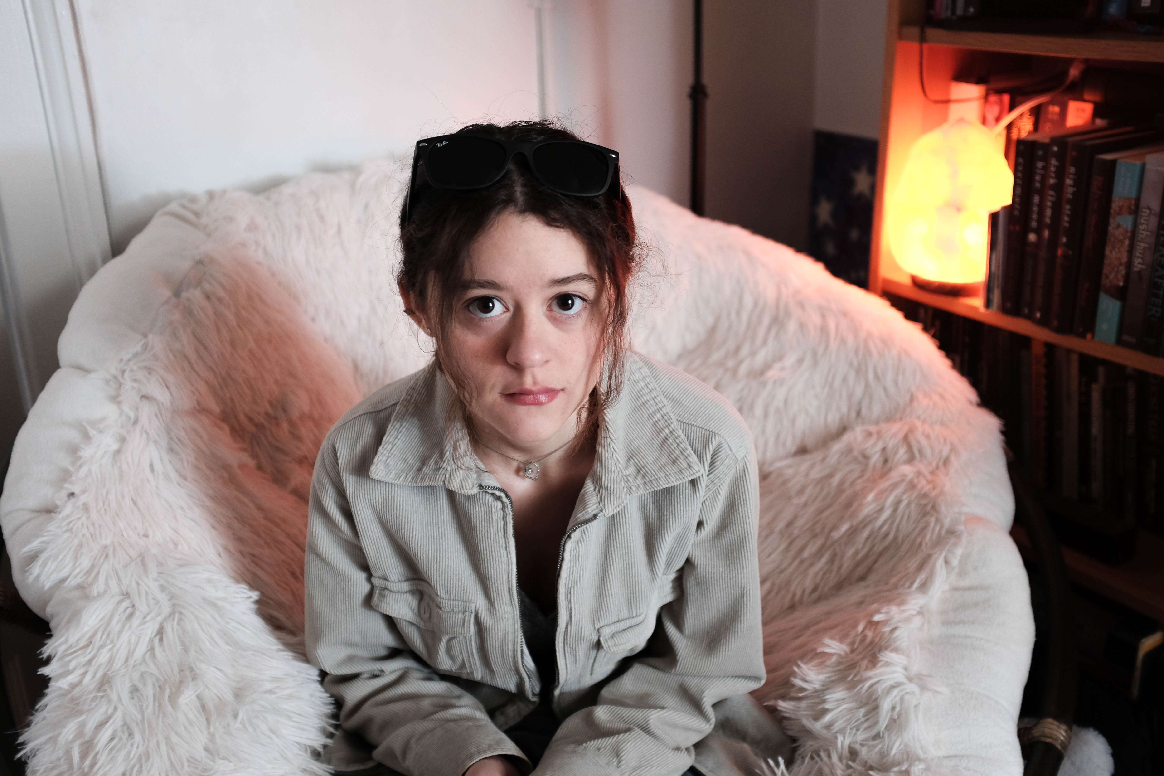 The photograph captures a young woman sitting on a plush, white chair, exuding a sense of introspection. Soft lighting from a nearby lamp casts a warm glow, enhancing the serene yet slightly melancholic mood. Her gaze is direct and engaging, inviting viewers to ponder her thoughts in this cozy, intimate setting.