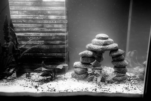 This black-and-white photograph captures a tranquil aquarium scene featuring a meticulously arranged stack of stones, forming an arch over a sandy substrate. The dim lighting and the subtle contrasts evoke a contemplative mood, enhanced by the gentle play of shadows across the surface. Surrounding aquatic plants add a touch of life to the composition, creating a harmonious blend of nature's elements.