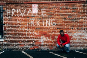 The photograph captures a young man in a red shirt sitting against a weathered brick wall marked by faded graffiti. The mood is reflective and somewhat somber, underscored by the stark contrast between his casual demeanor and the warning sign above him. Soft natural light illuminates the scene, enhancing the textures of the brick and emphasizing the isolation of the subject in an urban landscape.