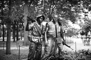 This poignant black-and-white photograph captures a trio of solemn bronze statues depicting soldiers, conveying a sense of brotherhood and sacrifice. Surrounded by the serene backdrop of greenery, the soft diffused light enhances the mood of reflection and remembrance. The close composition draws the viewer's gaze towards the expressions and postures of the figures, evoking a deep emotional resonance with the themes of courage and loss.