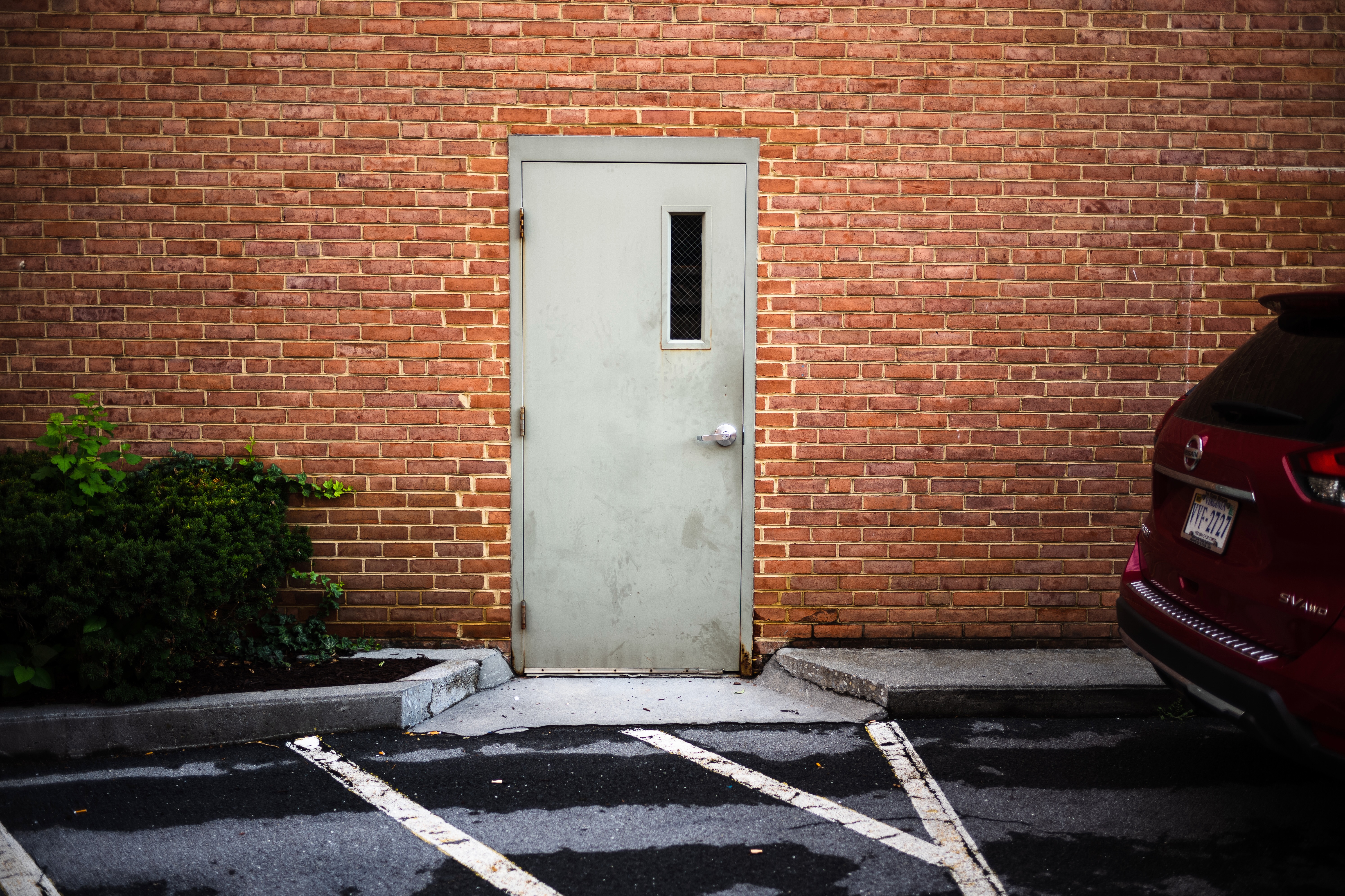 The photograph captures a solitary, muted green door set against a textured brick wall, evoking a sense of intrigue and secrecy. The composition is stark, with angled parking lines leading the eye towards the door, while a lush green shrub contrasts with the otherwise industrial scene. Soft, natural lighting bathes the area, adding depth to the subdued colors and enhancing the mood of quiet anticipation.