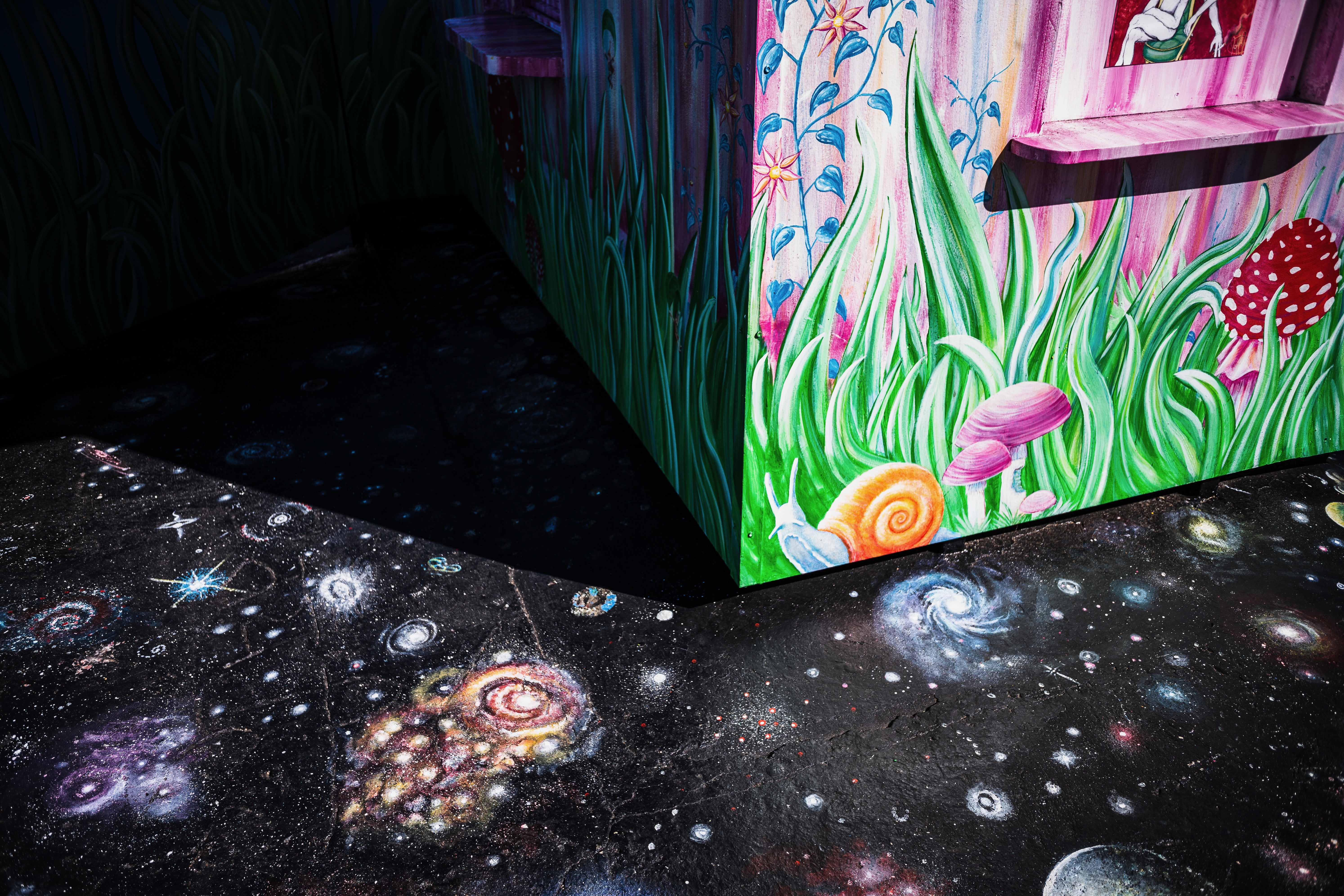 This photograph captures a vibrant corner of a mural, where fantastical flora meets a cosmic floor painted with swirling galaxies. The contrasting elements of playful garden imagery against a starry universe evoke a sense of wonder and imagination. Bright sunlight illuminates the scene, enhancing the colors and creating a striking visual interplay between the terrestrial and the celestial.