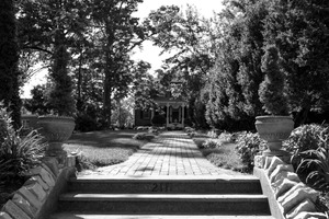 This black-and-white photograph captures a serene pathway leading to a quaint house, flanked by elegantly manicured bushes and decorative planters. The soft light filters through the trees, casting gentle shadows that enhance the tranquil mood of the scene. The composition invites the viewer to step into the lush greenery, evoking a sense of calm and nostalgia.