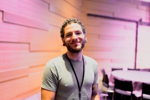 In a cozy, softly lit space, a man stands with a warm smile that suggests friendliness and approachability. The background features gently illuminated wooden panels, enhancing the relaxed atmosphere, while a hint of purple adds a touch of modernity. His casual attire and confident stance convey a sense of ease within this inviting environment.