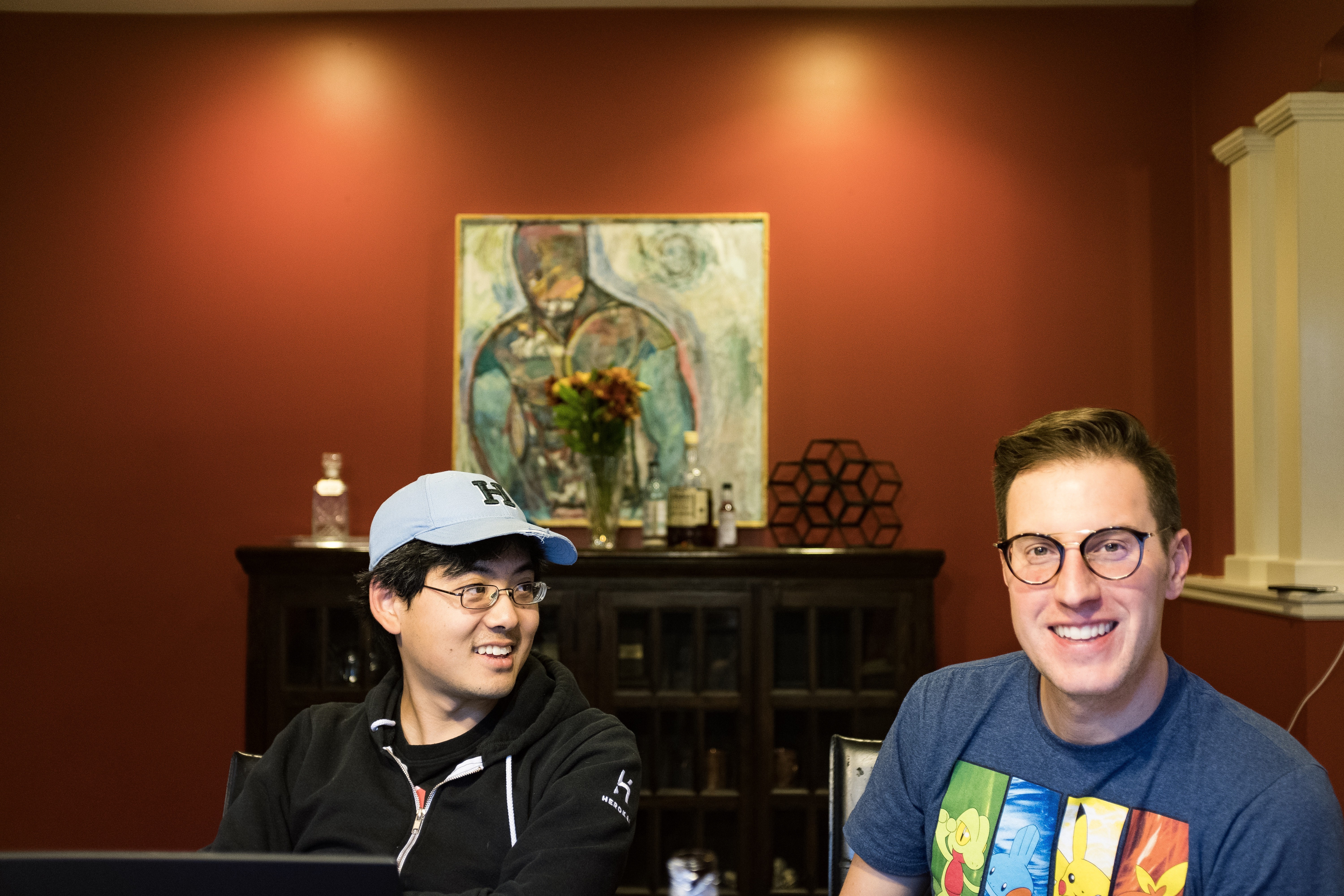 This photograph captures two friends engaged in a light-hearted conversation, their expressions radiating warmth and camaraderie. The rich, muted tones of the red wall contrast beautifully with a vibrant piece of art behind them, while soft lighting adds to the relaxed atmosphere of the intimate setting.
