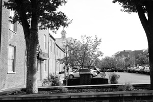 This black and white photograph captures a serene street scene lined with brick buildings and trees. The soft lighting casts gentle shadows, creating a calm mood as parked cars add a modern touch to the historical setting. The composition draws the eye along the path, inviting the viewer to explore the quiet neighborhood further.