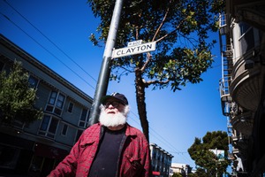A weathered man, draped in a vibrant red plaid shirt, stands in the sunlight beneath the Clayton street sign, embodying a sense of solitude and introspection. The vivid blue sky contrasts with the warm tones of the building facades, casting a lively yet nostalgic mood. Light filters through the nearby tree, creating dappled shadows that dance around him, enhancing the scene's urban charm.