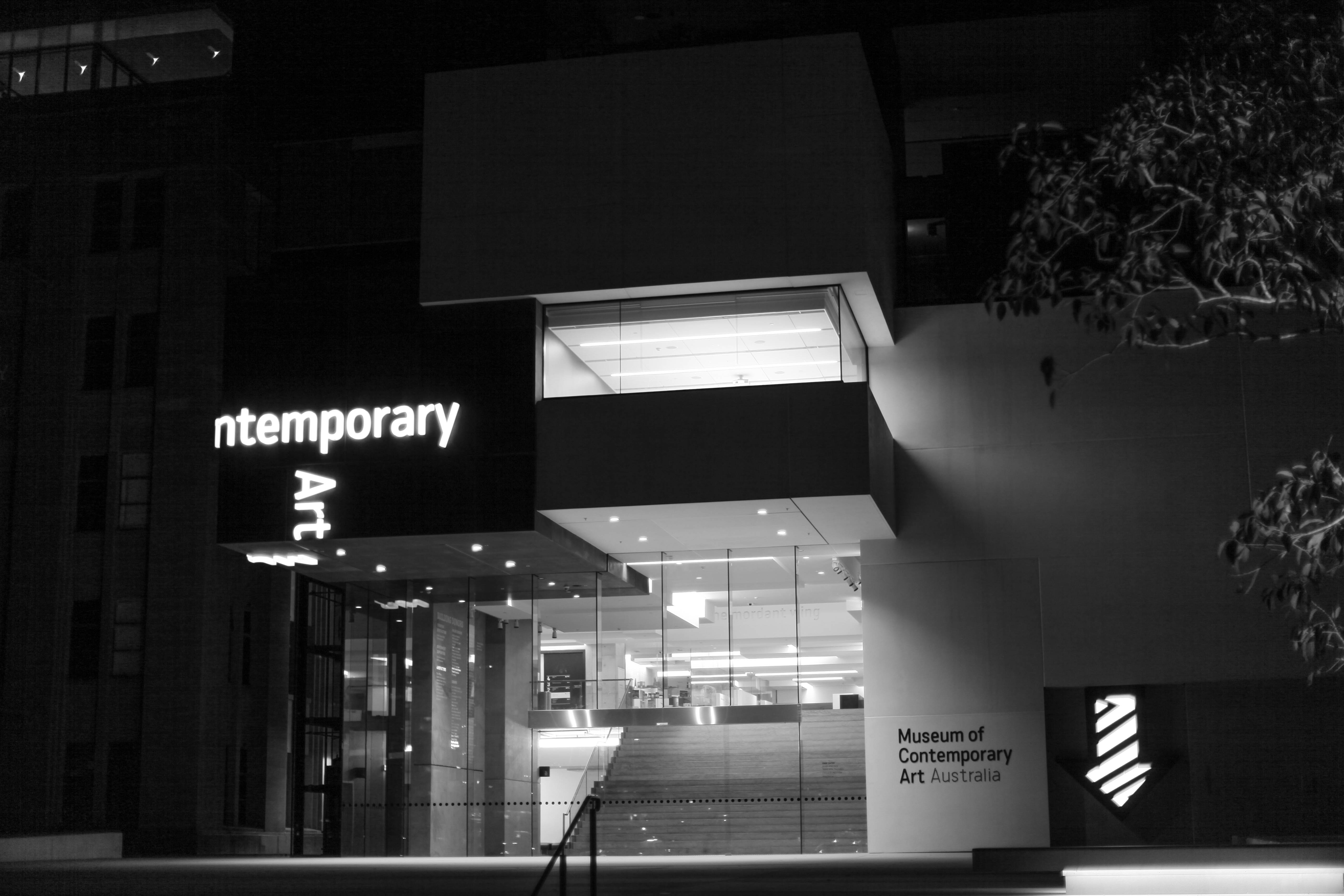 The striking facade of the Museum of Contemporary Art stands illuminated against the night sky, inviting the viewer into its modern embrace. The interplay of light and shadow enhances the sleek architectural lines, creating a serene yet vibrant atmosphere. With the bold signage and clear glass steps, the composition evokes a sense of curiosity and artistic exploration.