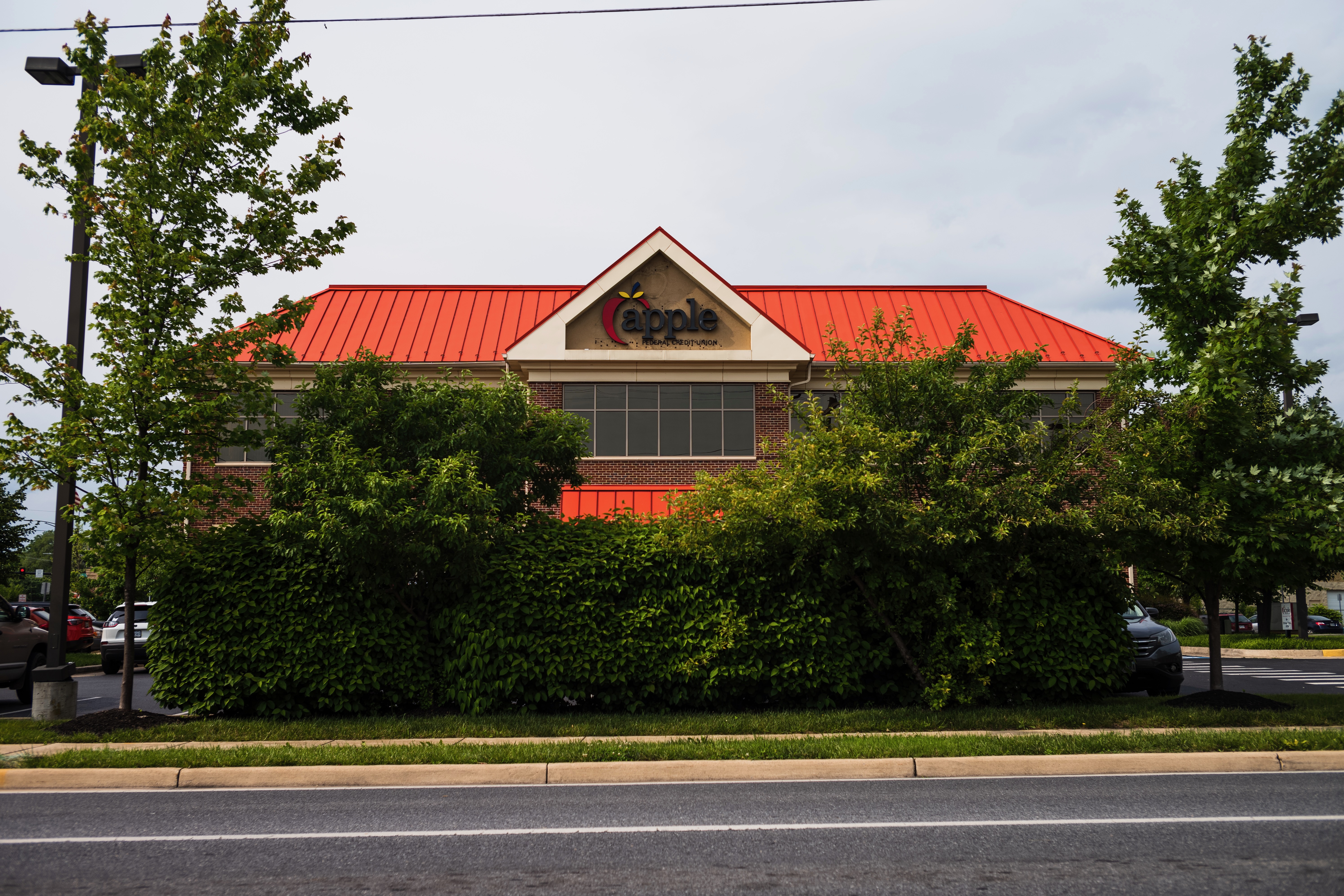 The photograph captures a building partially obscured by lush greenery, evoking a sense of intrigue and tranquility. The muted colors of an overcast sky enhance the calm atmosphere, while the bright red roof stands out amid the foliage. This composition invites viewers to wonder what lies behind the layers of leaves, blending urban structure with natural elements.