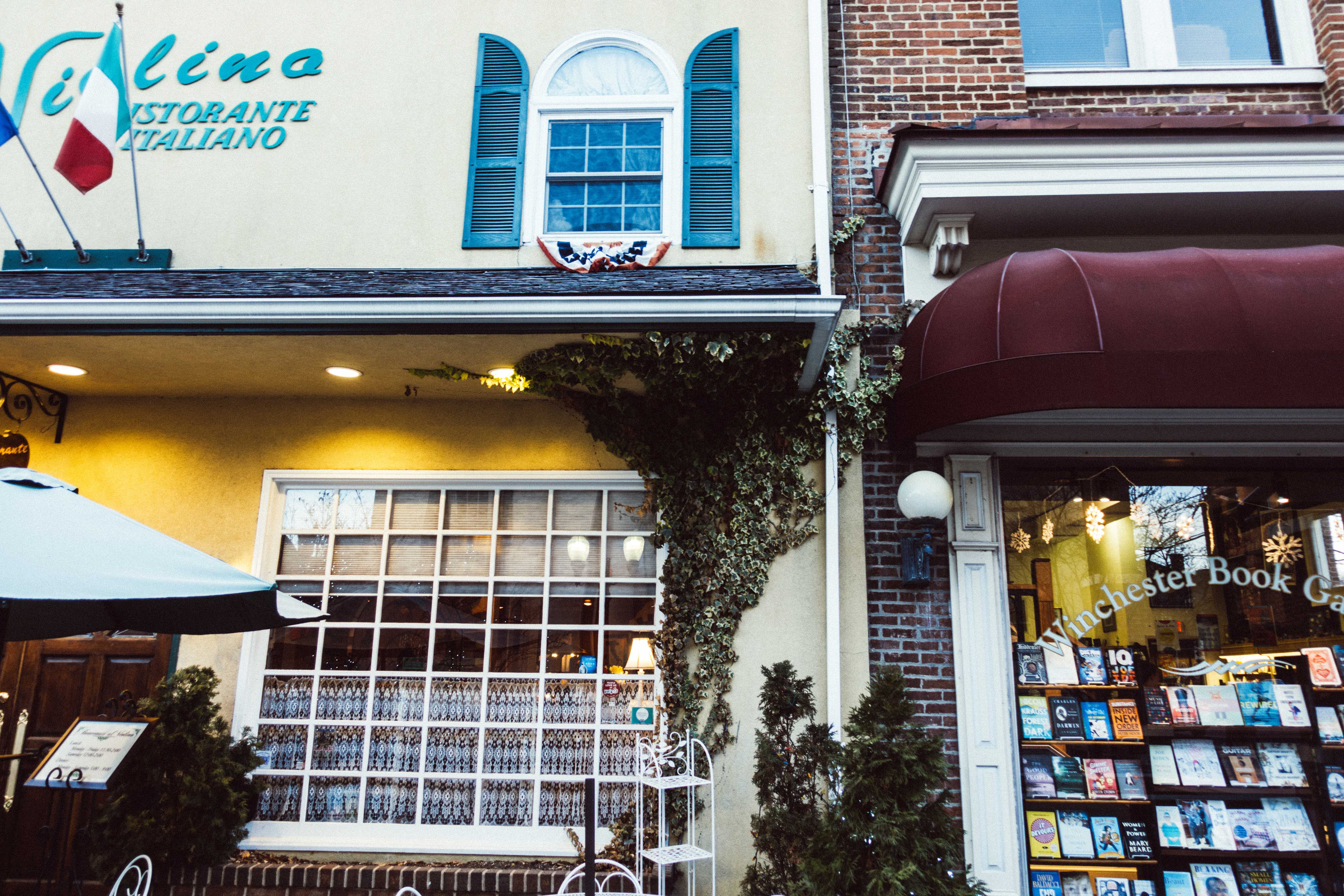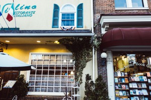 A quaint Italian restaurant stands beside a cozy bookstore, their warm hues inviting passersby. The gentle afternoon light highlights the colorful shutters and lush greenery, creating a serene and nostalgic atmosphere. Bunting decor adds a touch of festivity, evoking a sense of community and charm.
