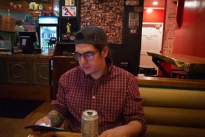 A young man, absorbed in his phone, sits in a casual eatery, surrounded by a warm ambiance and eclectic decor. The dim lighting casts soft shadows, enhancing the contemplative mood of the scene, while a glimmer of light reflects off a nearby can, adding a touch of life. The rich colors and textures create a cozy atmosphere, inviting viewers to share in this intimate moment of solitude.