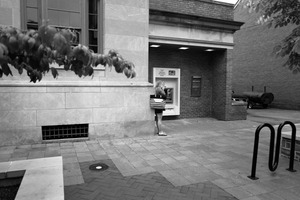 In a stark black and white composition, a lone figure stands by an ATM, clutching a striped bag, enveloped by the quiet architecture of the surrounding buildings. The interplay of light and shadow enhances the mood of solitude, while the rhythmic patterns of the bricks and pavement create a sense of stillness. This scene captures a brief, contemplative moment in an otherwise bustling world.