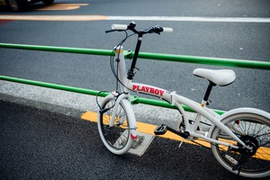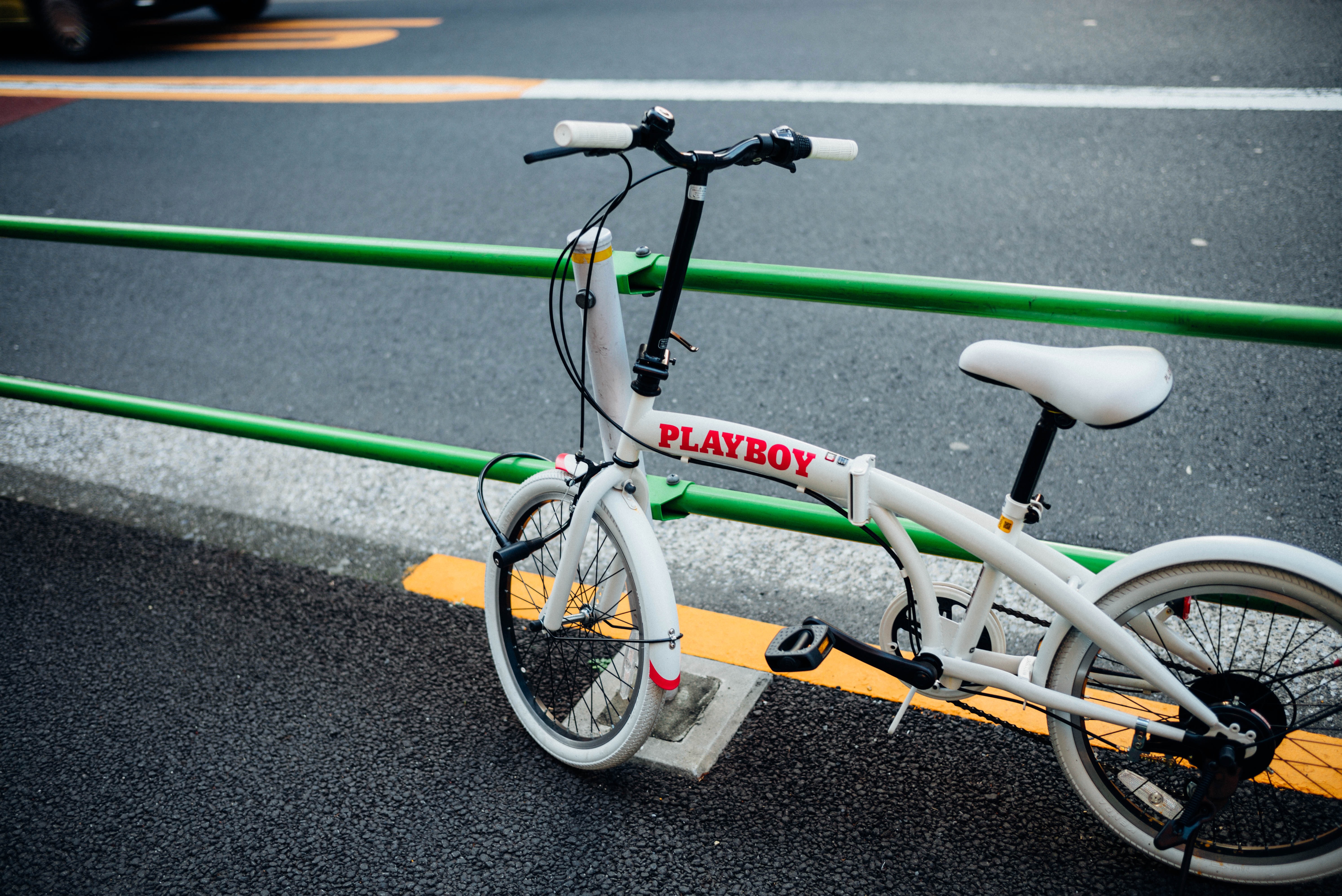A stylish white bicycle stands against a backdrop of asphalt, its playful 'PLAYBOY' branding adding a touch of youthful rebellion. The composition captures the contrast between the sleek bike and the gritty urban environment, while the bright green railing and warm yellow line provide a pop of color against the subdued gray tones. Soft lighting enhances the bike’s contours, imbuing the scene with a sense of calm amidst the bustling city life.