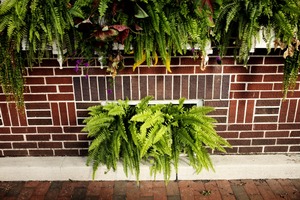 This photograph showcases lush ferns cascading over a patterned, warm-toned brick wall. The vibrant greens of the foliage contrast beautifully with the earthy reds and browns of the bricks, creating an inviting and tranquil atmosphere. Soft, natural lighting enhances the textures, giving a sense of serenity and life to the composition.