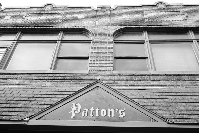The photograph captures the subtle grandeur of a brick building facade, featuring the name 'Patton's' prominently displayed. The composition emphasizes the architectural details and windows, while the monochromatic palette evokes a nostalgic and timeless mood. Soft light accentuates the textures of the bricks and the faded paint, adding depth to this elegant structure.