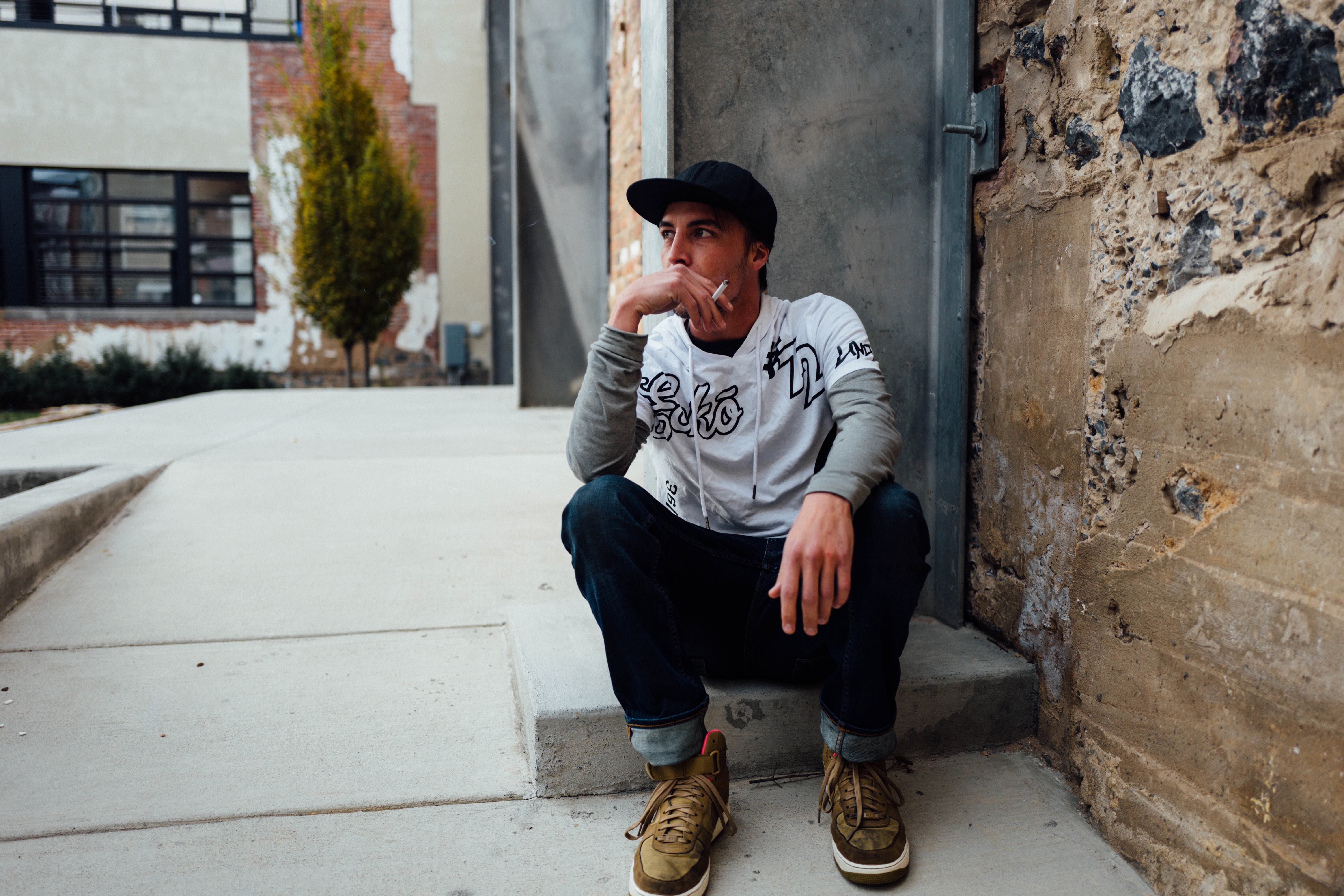 A young man sits contemplatively against a textured wall, his posture exuding a blend of relaxation and introspection. The soft, muted lighting casts gentle shadows, enhancing the gritty urban backdrop that surrounds him. His casual attire and the cigarette in hand contribute to a mood of nonchalance and thoughtful solitude, inviting viewers into a moment of quiet reflection amidst the hustle of city life.