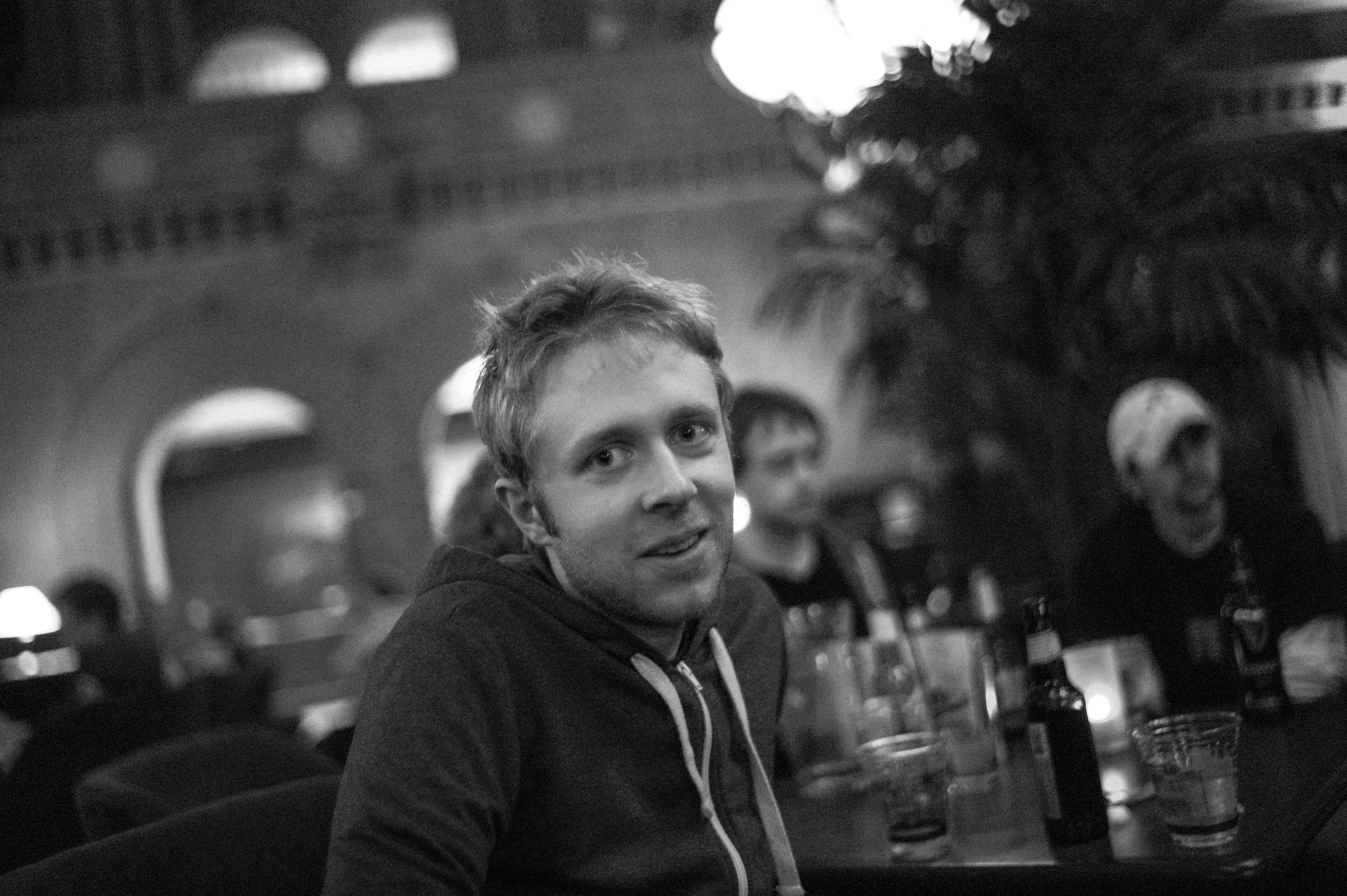 The photograph captures a candid moment of a young man seated at a lively bar, exuding a casual charm. Soft lighting and shadowy figures in the background create an intimate atmosphere, while the monochromatic palette adds a timeless quality to the scene. The subjects engage in muted conversation, hinting at camaraderie and the warmth of shared company.