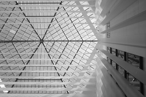 This striking black-and-white photograph captures the intricate web of beams and glass overhead, showcasing a sophisticated architectural design. The stark contrasts and geometric patterns create a dynamic tension, evoking a sense of upward movement and modernity. The soft light filtering through the glass adds a serene, almost ethereal quality to the composition, inviting viewers to look closer.