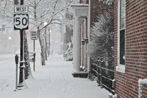 This photograph captures a quiet, snow-covered street scene, where gentle flakes float down and blanket everything in a soft, white hue. The composition emphasizes a lonely sidewalk lined with historic buildings and the faint outlines of traffic signs, creating a sense of stillness amidst the winter storm. The muted lighting adds an ethereal quality, enhancing the peaceful yet somber mood of a snowy day.