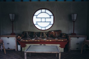 This photograph captures a serene indoor space, dominated by a beautifully patterned sofa beneath a large circular window. The soft, muted lighting evokes a tranquil atmosphere, enhanced by the minimalist decor and gentle color palette. A sense of calm and simplicity permeates the scene, inviting viewers to pause and reflect.