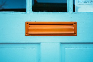The photograph captures a bright orange mail slot set against a soft, blue door, creating a striking contrast. The mood is inviting yet peaceful, highlighting a subtle invitation for interaction. Soft natural light enhances the colors, lending a warm touch to the composition while the focused framing draws attention to the simplicity of everyday life.