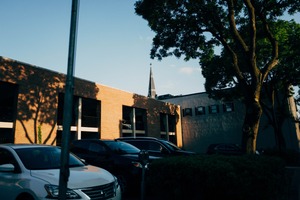 Bathed in the warm glow of late afternoon light, this urban scene captures a blend of natural and architectural elements. The soft shadows cast by trees mingle gently with the contours of buildings, creating a serene atmosphere punctuated by the tall church steeple in the background. A sense of quiet introspection pervades, inviting viewers to pause and reflect in this moment of peaceful city life.