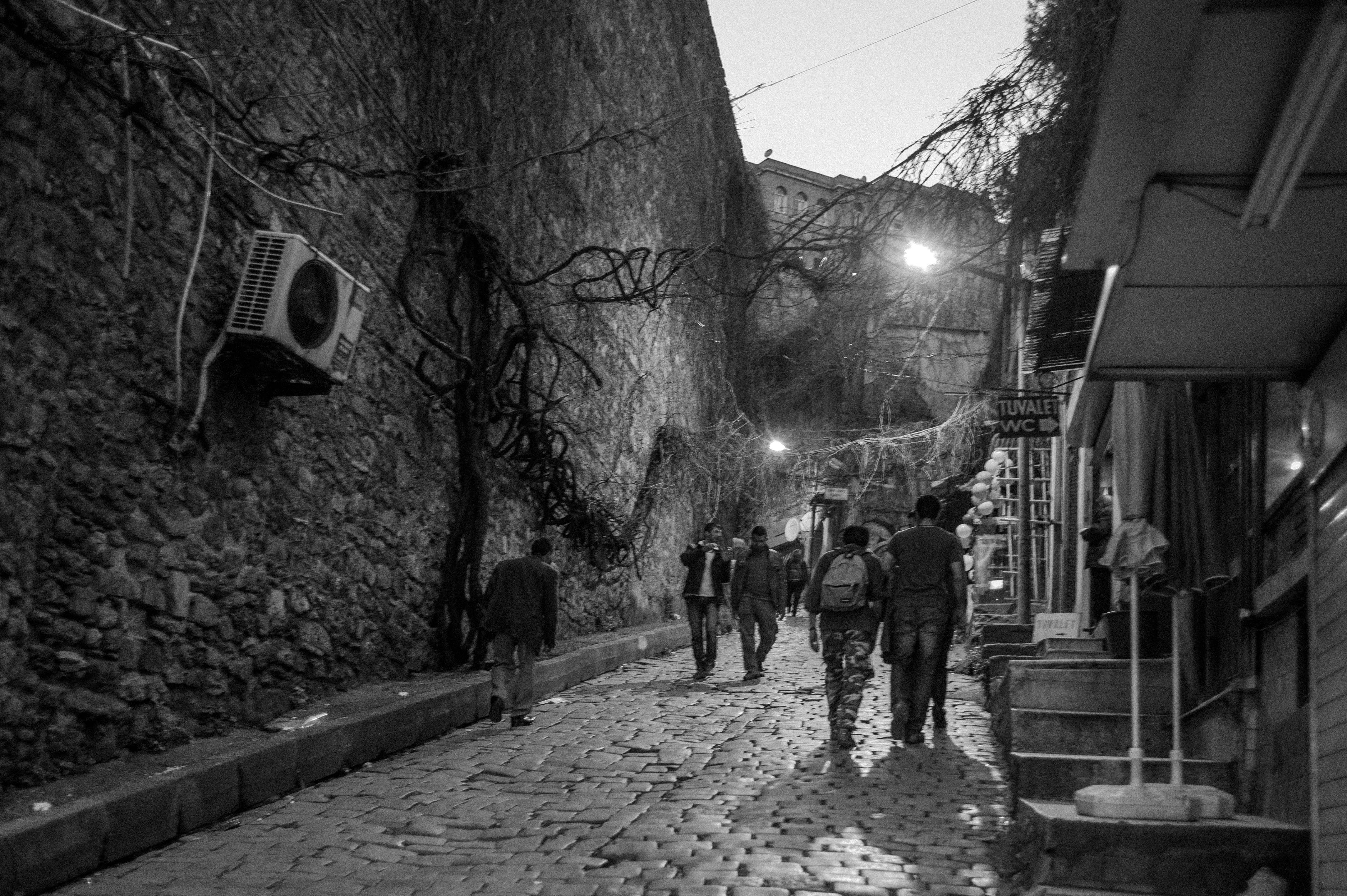 In a quiet, narrow street illuminated by dim streetlights, a group of people walks along cobbled paths, creating an air of camaraderie. The black and white tones enhance the mood, giving a timeless quality to the scene, while the weathered stone walls and loose vines add texture and depth. Shadows stretch out, evoking a sense of mystery as the day transitions into evening.