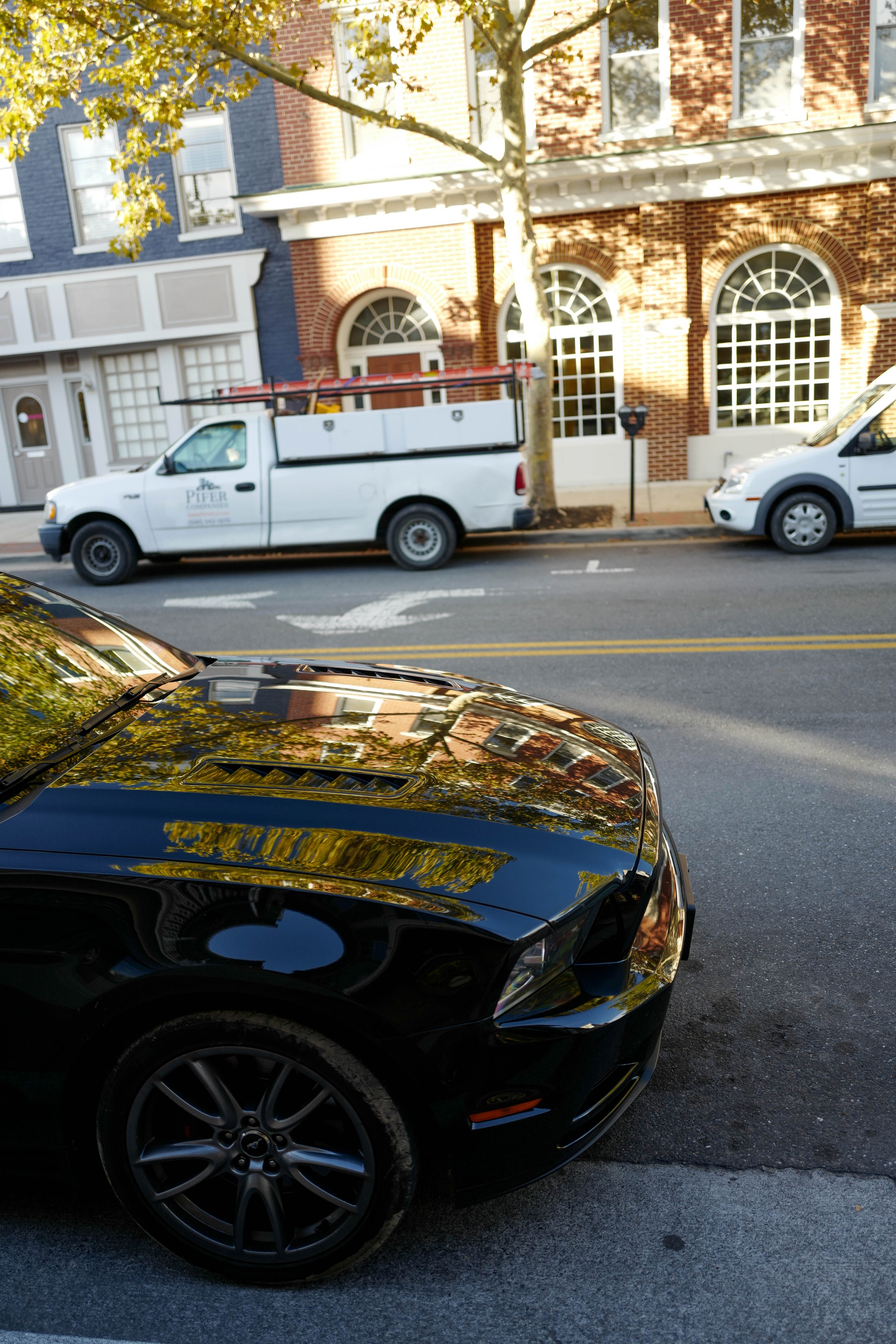 A sleek black car stands out on an urban street, its glossy surface reflecting the warm hues of golden autumn leaves and the charming facade of the nearby brick buildings. The composition captures a moment of stillness amidst the understated busyness of city life, enhanced by soft, natural lighting that bathes the scene in a tranquil glow. The angled perspective invites the viewer to appreciate the harmonious blend of nature and urban elements.