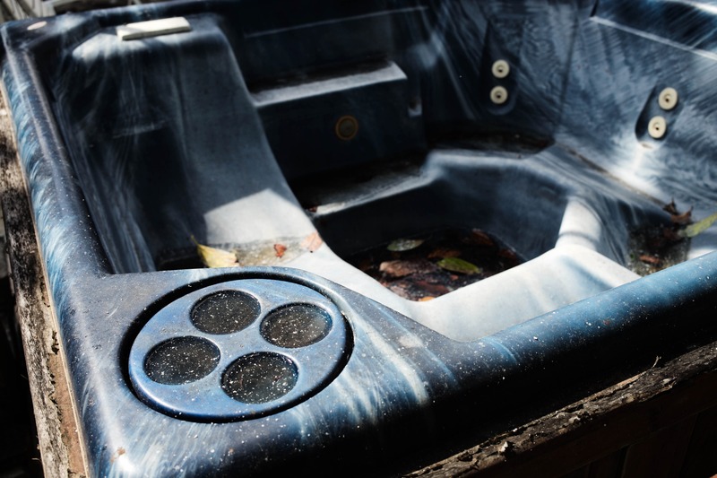 A neglected hot tub, its vibrant blue hue dulled by time and scattered leaves, captures a sense of abandonment. Shimmering dappled sunlight spills across the surface, creating a stark contrast between the allure of relaxation and the reality of disuse. The composition invites reflection on fleeting moments of joy, now replaced by stillness and decay.