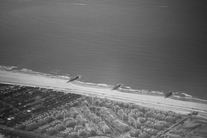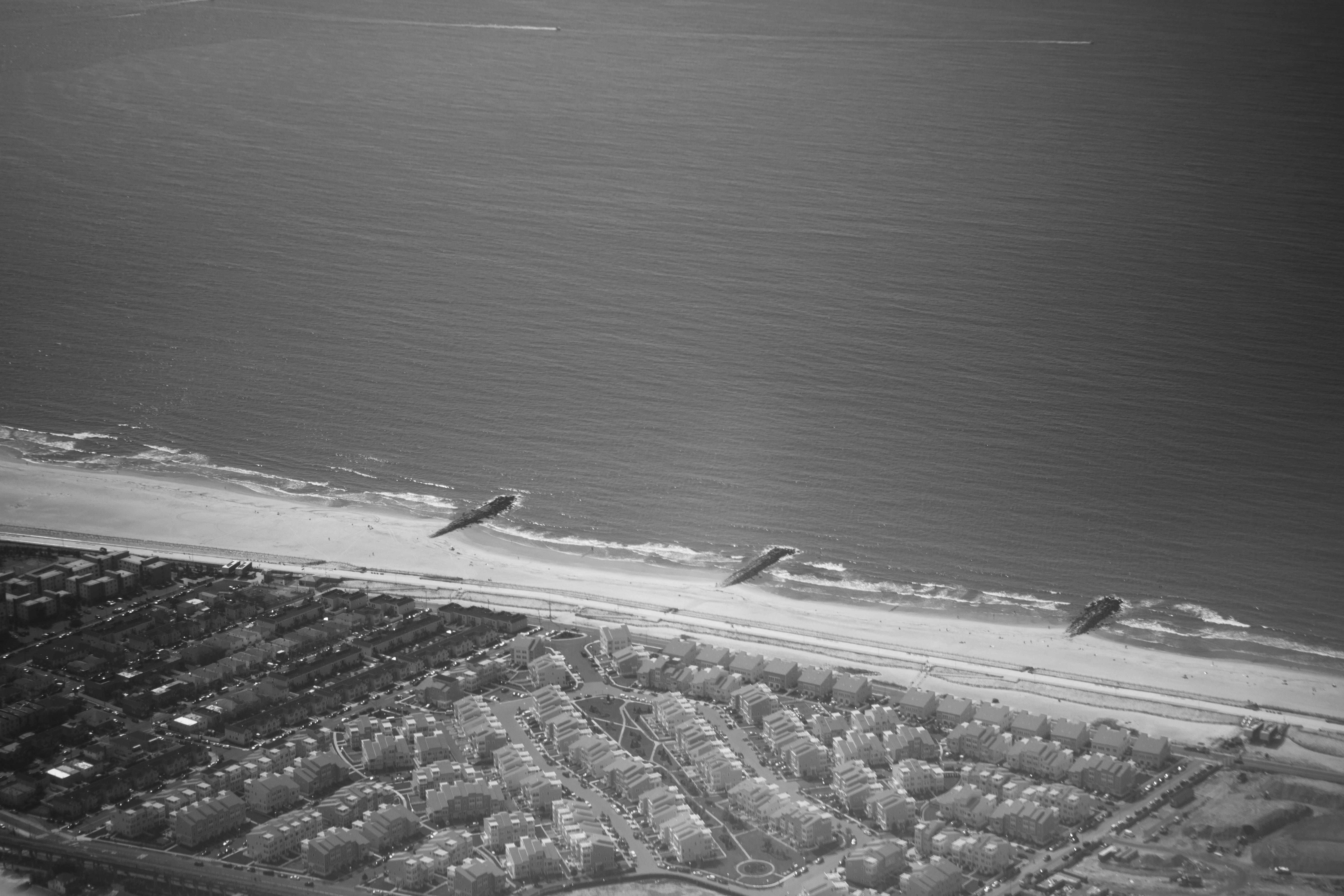 This aerial photograph captures a tranquil seaside landscape, divided between the ruggedness of the ocean and the organized layout of beachside residences. A muted monochrome palette enhances the calmness of the scene, with the distant piers extending into the water, inviting exploration. The soft, diffused lighting creates a serene mood, evoking a sense of peaceful solitude.