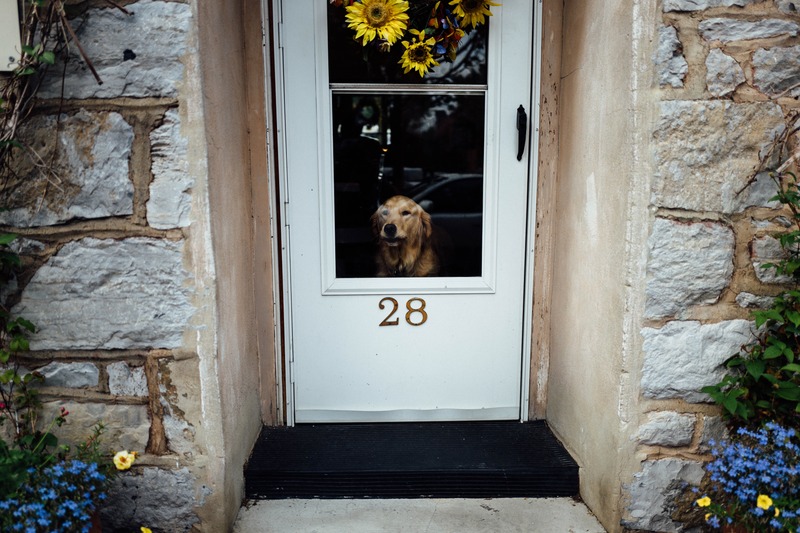 A golden retriever gazes affectionately through a charming white door adorned with vibrant sunflowers. The soft lighting highlights the dog's friendly expression, creating a warm and inviting atmosphere. Framed by textured stone walls and blooming flowers, the scene evokes a sense of home and companionship.