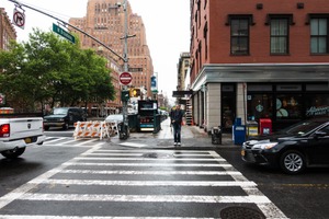 This photograph captures a quiet moment on a rainy city street, where a lone figure stands on the crosswalk, seemingly lost in thought. The muted tones and reflective wet pavement enhance the serene mood, while the surrounding buildings loom protectively, creating a sense of intimate urban isolation. Soft, diffused light from the overcast sky bathes the scene, highlighting the contrast between the bustling city life and the tranquility of the rain-soaked day.