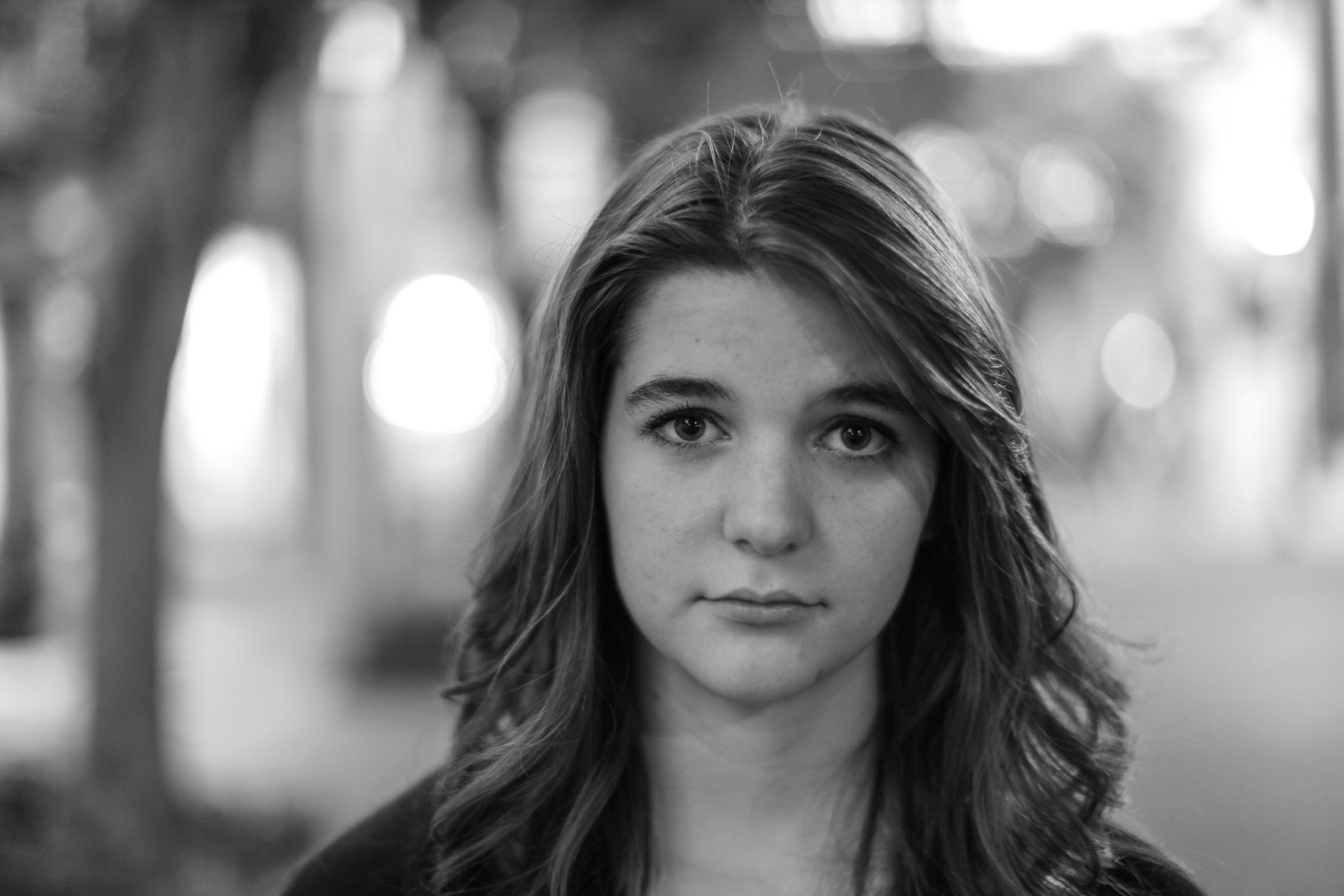 This striking black-and-white portrait captures a young woman with an introspective expression, her gaze holding depth and emotion amidst a softly blurred background. The interplay of light and shadow highlights her features, creating a mood that is both contemplative and poignant. The composition focuses tightly on her face, drawing viewers into her quiet moment in an urban setting.