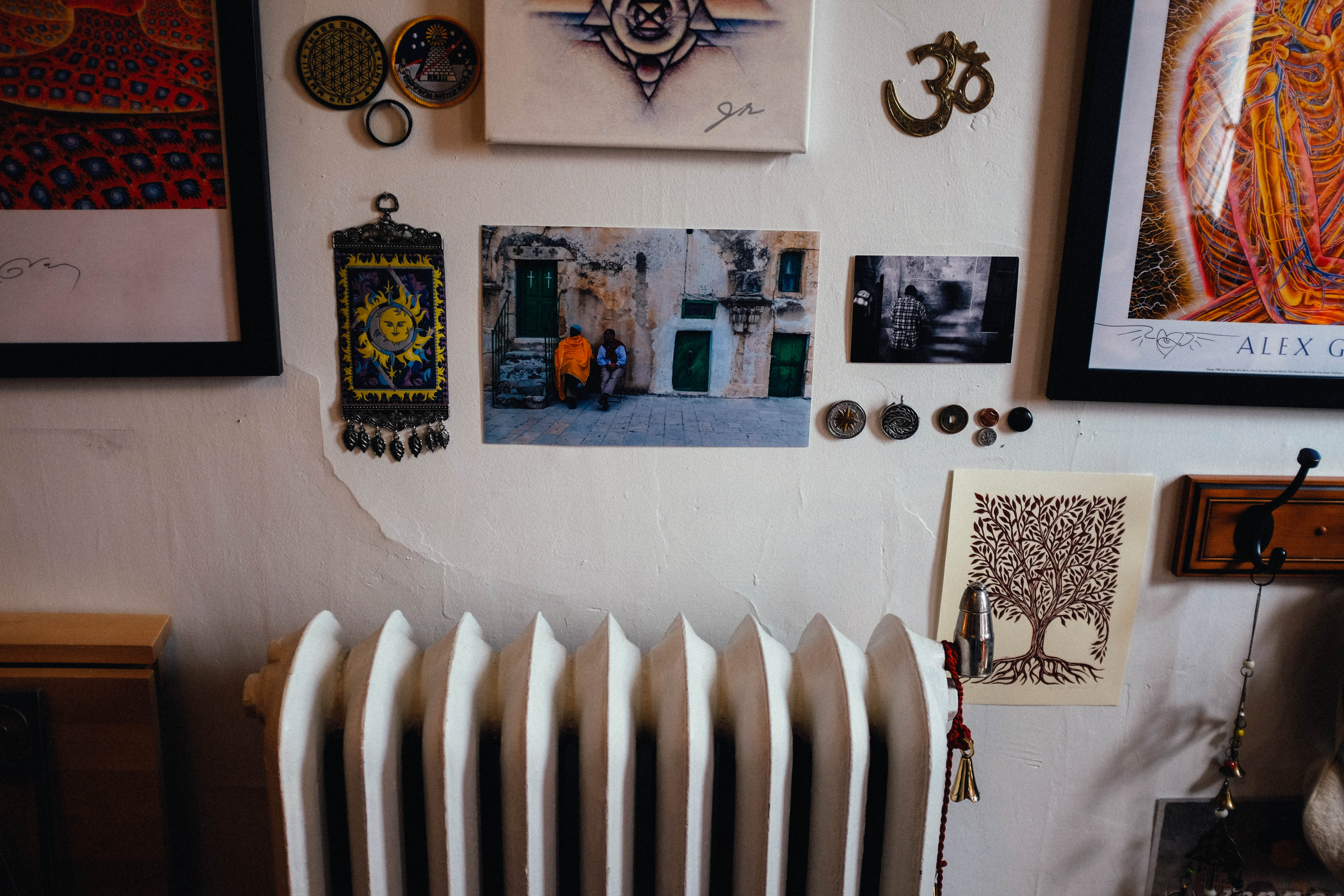 This photograph captures a vibrant collage of personal artifacts and photographs against a textured white wall, with a focus on a vintage radiator at the bottom. The warm lighting enhances the intimate, nostalgic atmosphere, inviting viewers to explore the stories behind each piece. A mix of colors and shapes creates visual harmony, balancing the spiritual and artistic elements of the display.