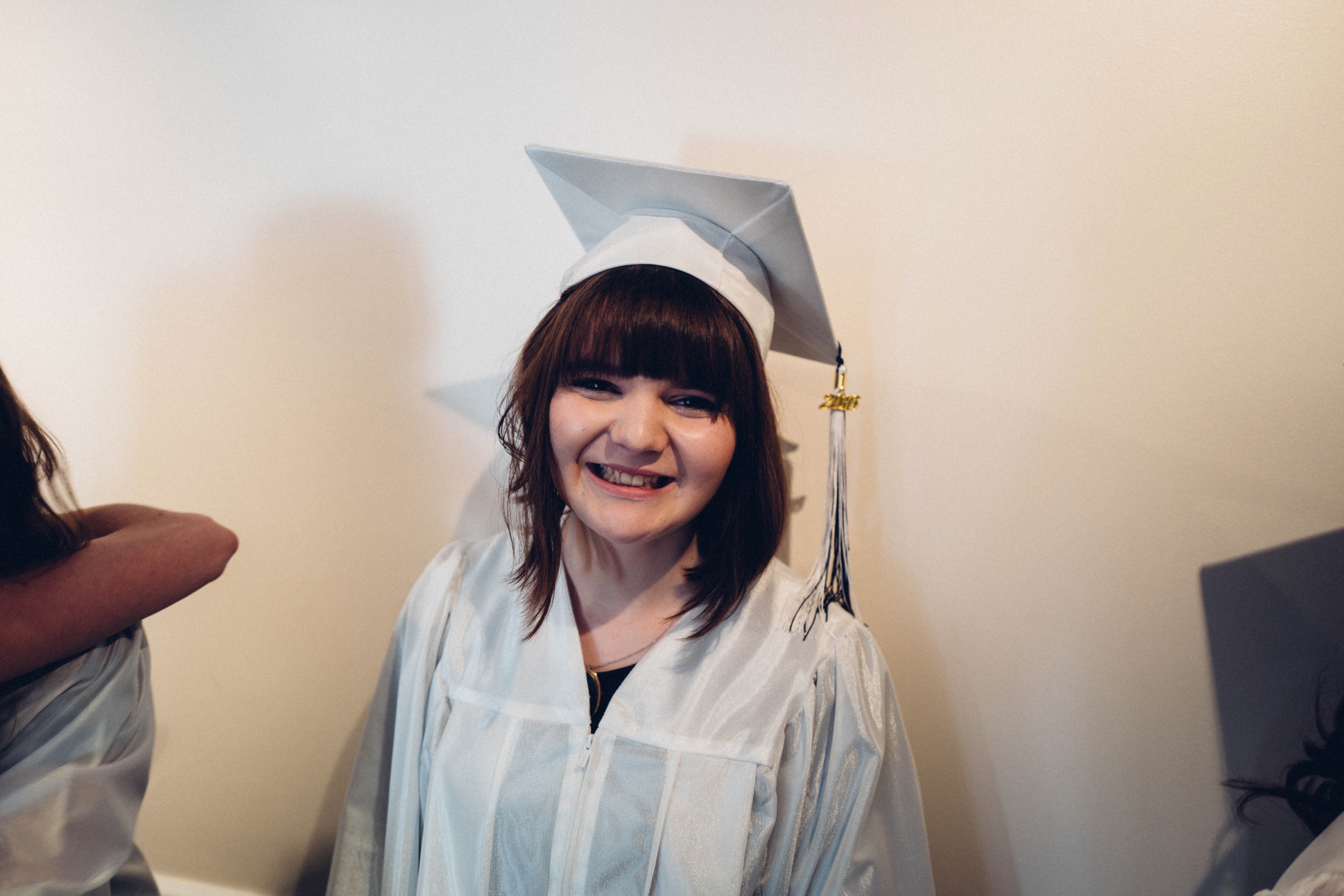 The photograph captures a young woman in a gleaming silver graduation gown and cap, beaming with joy and pride. Soft natural light illuminates her face, emphasizing her exuberant smile against a minimalistic backdrop. The atmosphere is filled with a sense of celebration and accomplishment, marking a significant achievement in her life.