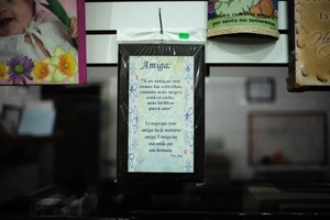 The photograph captures a framed inspirational quote about friendship, prominently displayed against a dark backdrop. Its soft, colorful flowers and gentle lighting evoke a warm, inviting mood, while the blur of surrounding items adds a sense of context and familiarity. The contrast between light and darkness highlights the significance of the message within the frame.