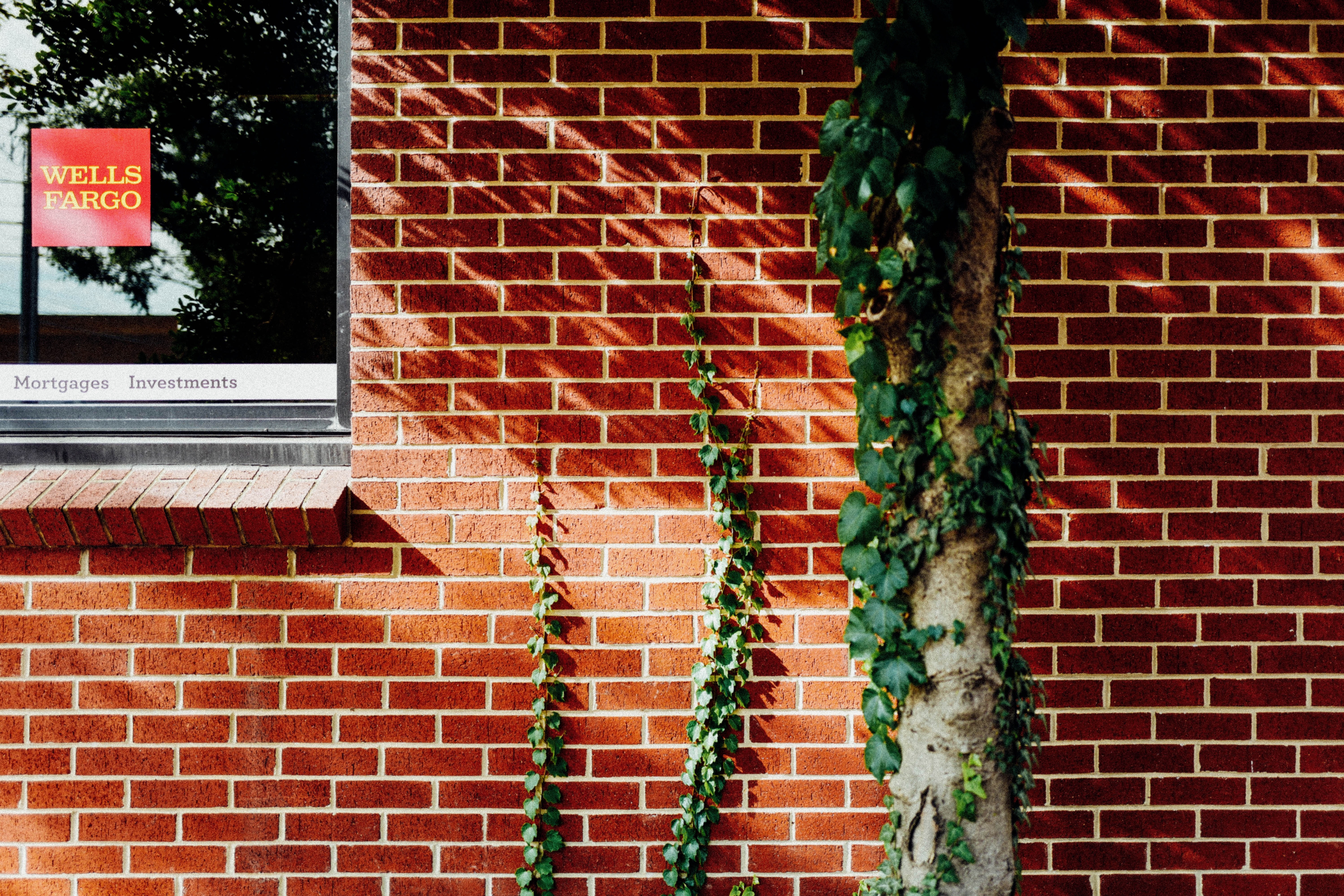 This photograph captures a striking contrast between urban structure and natural growth. The vibrant red bricks of a building frame a window with the Wells Fargo logo, while lush green vines climb alongside, casting intricate shadows. The interplay of light enhances the mood, evoking a sense of both solidity and life in an urban environment.